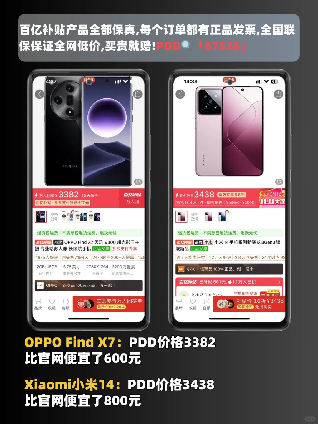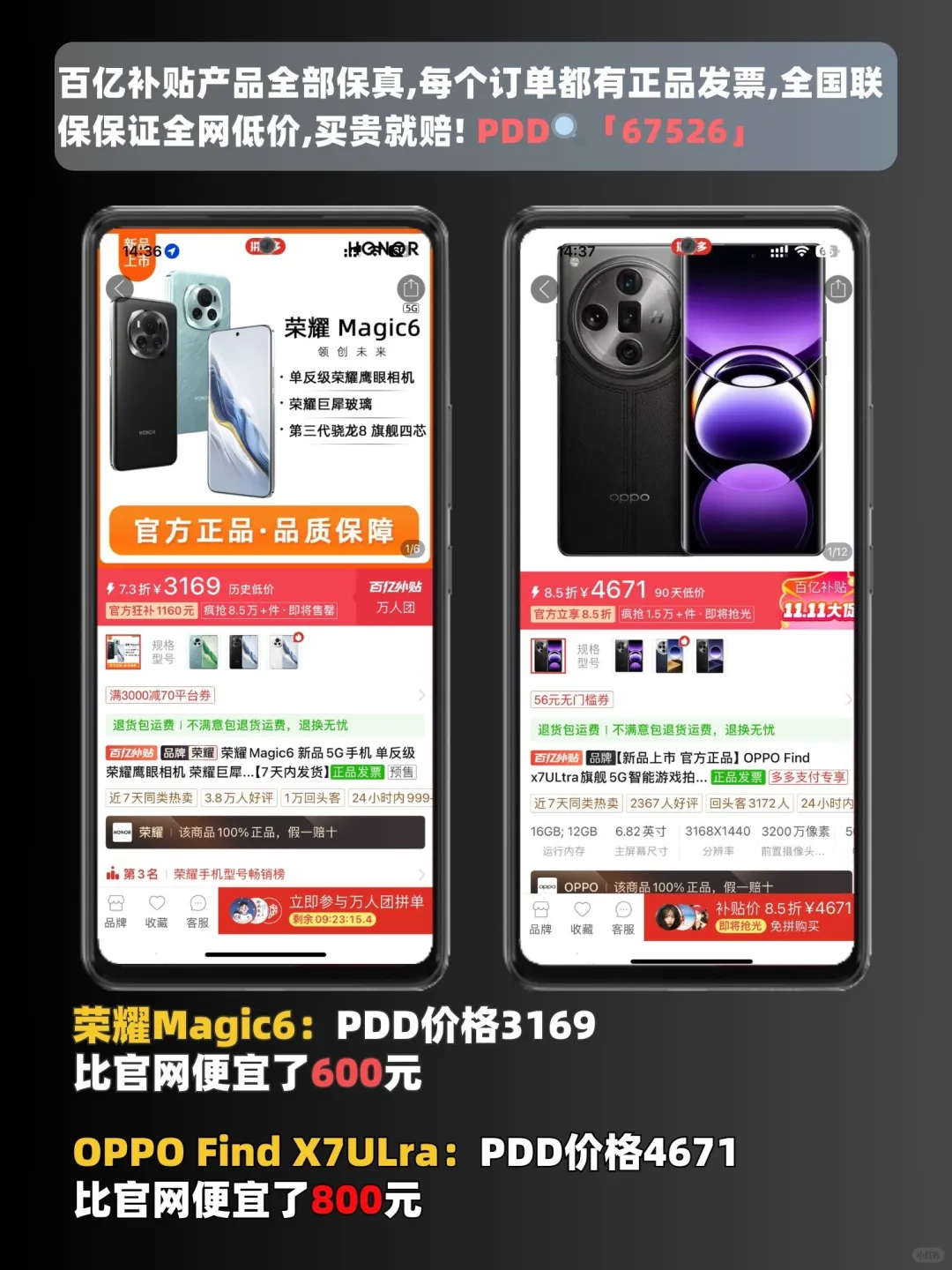 想买安卓手机的小伙伴看过来啦[哇R][哇R]今天Robin给大家带来了近期热门的安卓旗舰机的购买指南‼️ 首先为什么要买旗舰机❓ 处理器先进 内存和存储大 摄像头配置高 屏幕素质高 软件支持与更新更优 为什么选择下面这几款⁉️ 荣耀Magic6: 它在拍照方面表现优异,采用了单反级鹰眼相机它搭载了第二代青海湖电池,拥有5450mAh的大容量,可以保证用户在日常使用中的电量需求。搭载了骁龙8 Gen3旗舰处理器,性能非常强劲,可以满足用户在日常使用和游戏等方面的需求。 OPPO Find X7: 潜望长焦镜头、自研的潮汐架构、天玑9300芯片、端侧70亿大模型、100瓦有线超级闪充,就这些参数放到同价位附近算是佼佼者 小米14: 机身小巧,四边等宽的视觉效果非常不错,另外在握持时也较易贴合手型,性能表现出色,日常使用和游戏体验都足够,多任务处理都能轻松胜任。游戏时马达震感体验不错 如何低价买⁉️ 打开PDD,首页搜索「67526」可直达爆款手机补贴专区[飞吻R][飞吻R] 搜索心仪的手机型号,就可以低价入啦‼️ 专区超多手机品牌的旗舰款,买前都可以搜一下及进入专区,比比价,当个参考哦[派对R][派对R] 荣耀Magic6比官网便宜了600元 OPOO Find X7ULra比官网便宜了800元 OPPO Find X7比官网便宜了600元 Xiaomi小米14比官网便宜了800元 质量大家也不用担心❗️ 拼多多百亿补贴官方承诺,✅100%正品✅全网低价✅假一赔十✅买贵必赔