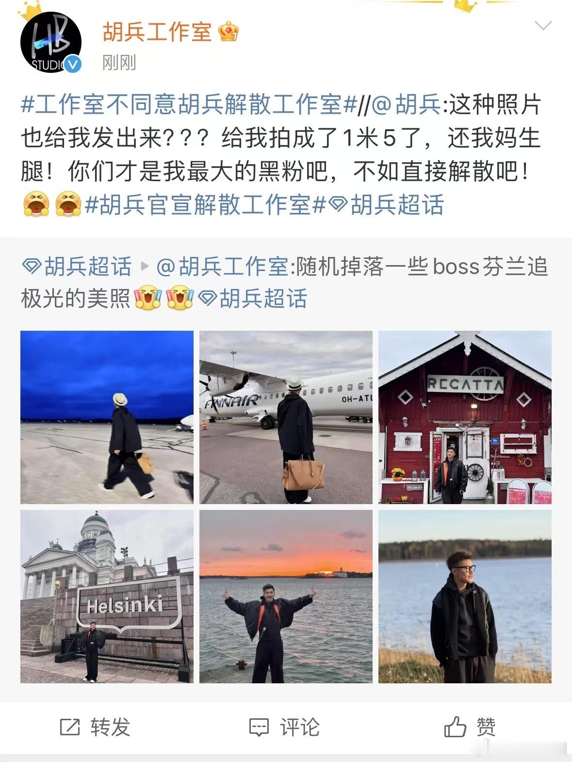 #胡兵官宣解散工作室##胡兵还我妈生腿# 眼泪都要快要笑出来了,胡兵真的是太有幽默感,其实我觉得咱们大哥自己也没有想到自己会被拍得这么矮的呀,看到这一幕也太有趣了。
