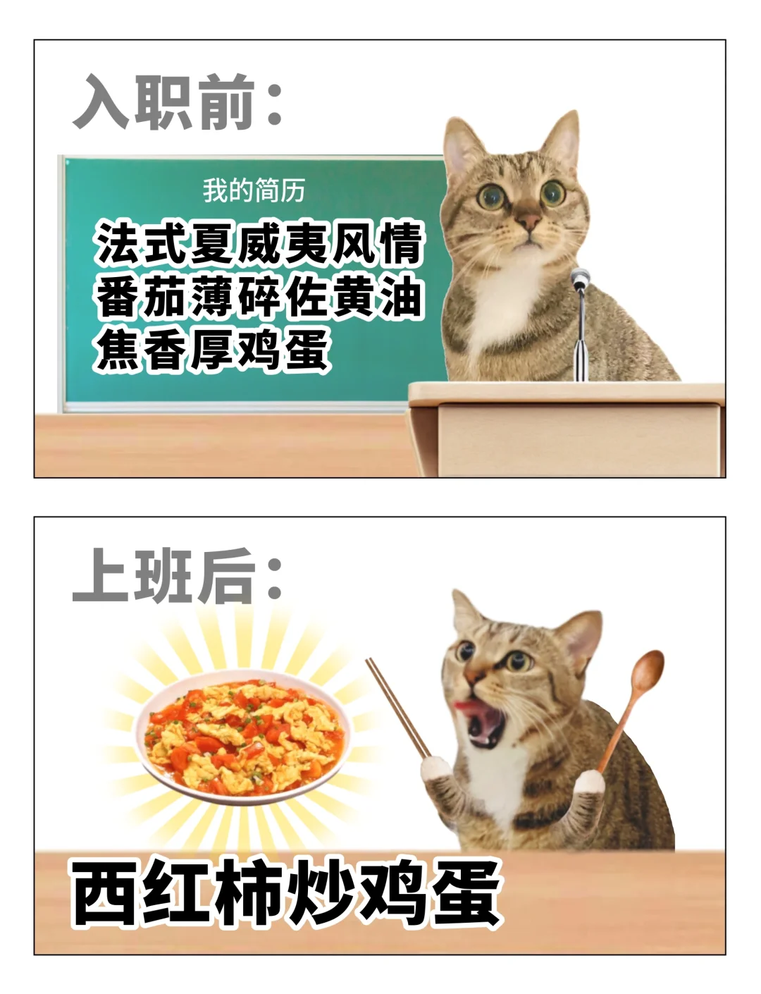 入职前:能熟练使用英语与客户交流 上班后:点头yes摇头no,来是come去是go 入职前:无限可能 上班后:无能 入职前:精通办公软件 上班后:会打开关闭 入职前:努力成为领导心腹 上班后:努力成为领导心腹大患 入职前:法式夏威夷风情番茄薄碎佐黄油焦香厚鸡蛋 上班后:西红柿炒鸡蛋