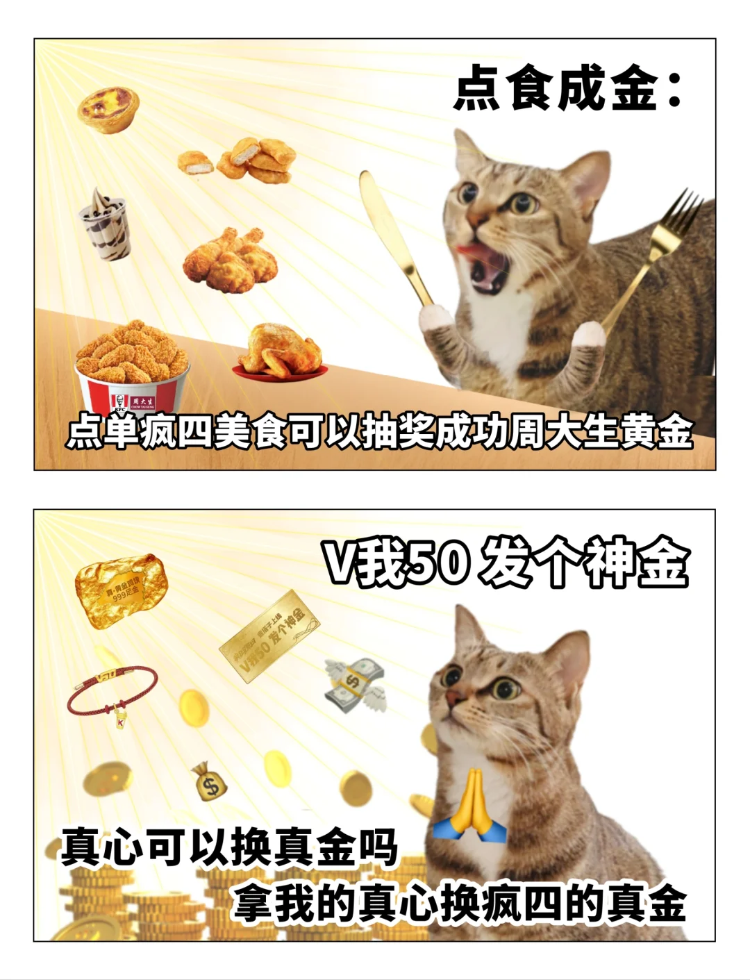 想要黄金鸡块,肯德基周大生联名999足金的那种~ V我50,发个神金!4月25日及5月2日两天,肯德基&周大生送真黄金啦!999足金真金块!肯德基app/小🍊序买疯四产品即可抽奖。