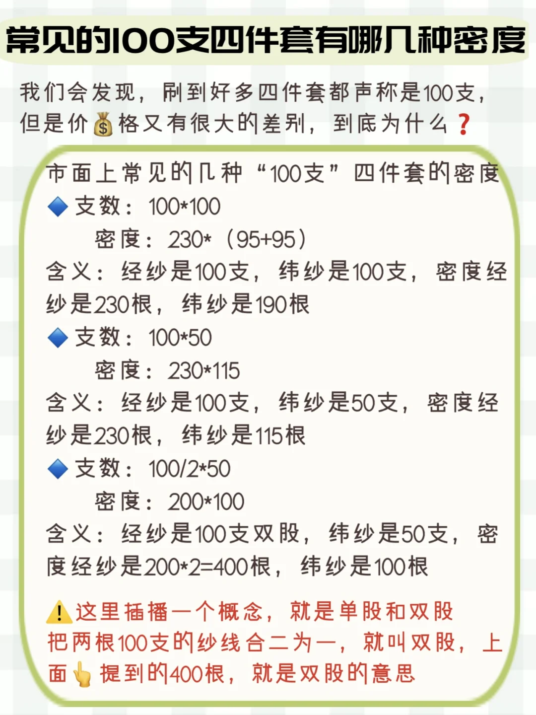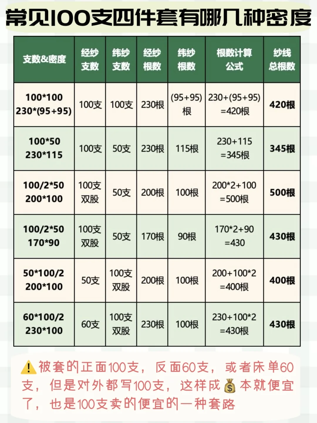 市面上常见的几种“100支”四件套的密度有哪些,给大家整理了表格,放图6了⬆️⬆️