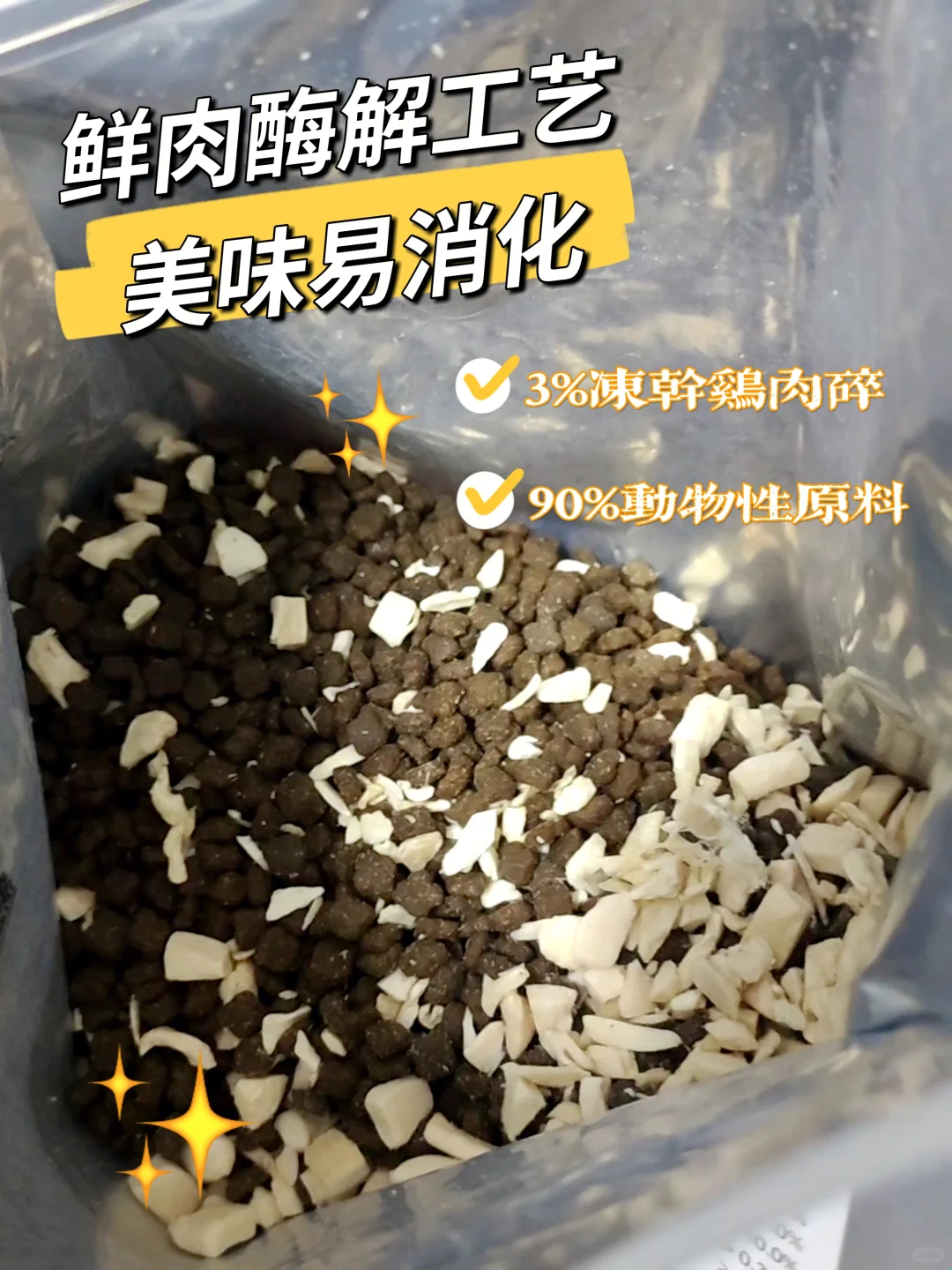 这款粮开袋就能看见多多的冻干碎,为我这种天选打工人,免去了单独添加冻干的烦恼,也解决了猫挑嘴的困扰。