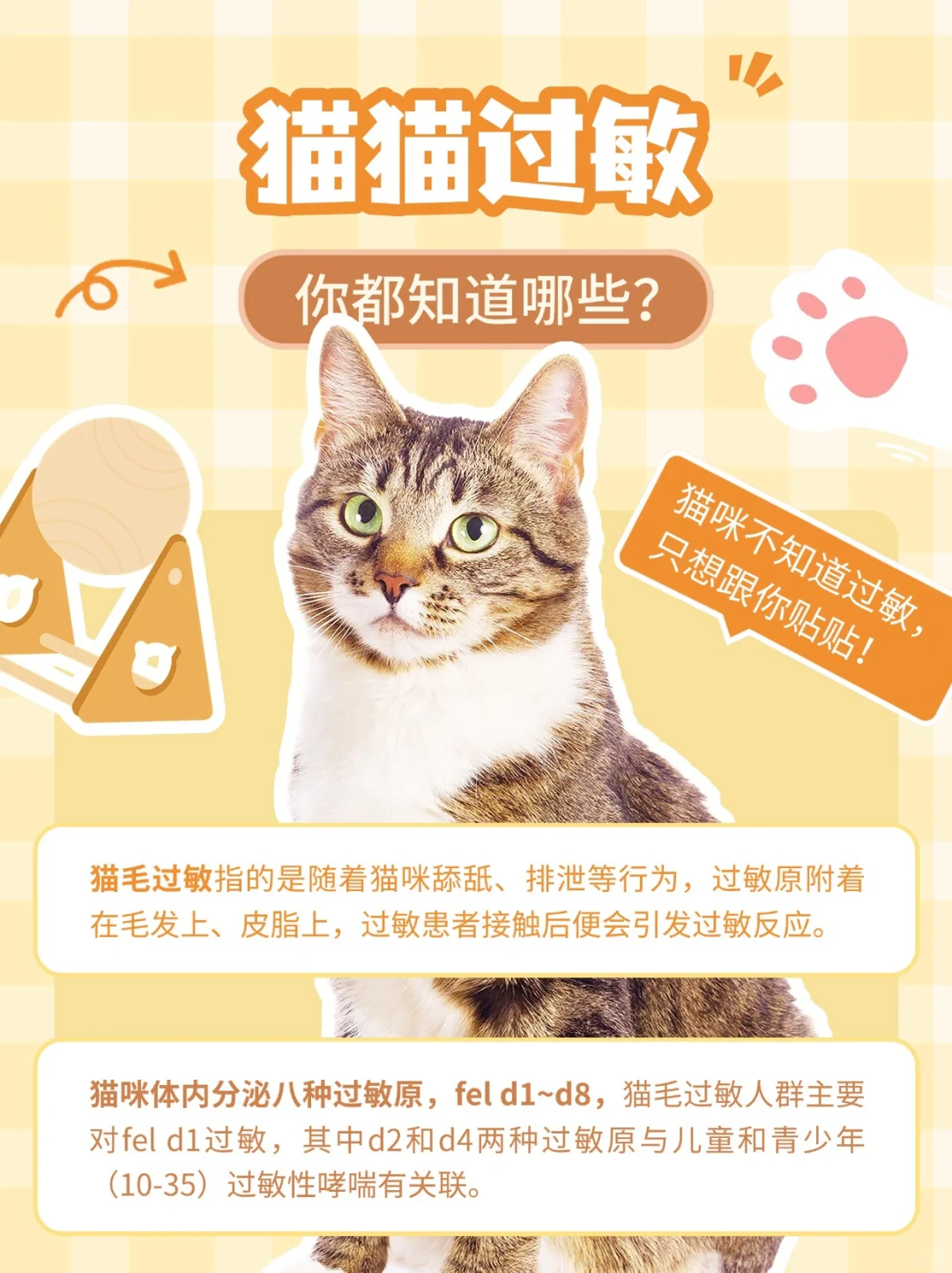 猫毛过敏其实是对猫咪分泌的八种致敏原蛋白过敏,其中国外有研究表明对fel d1、fel d2、fel d4过敏的人占比更高,当环境中过敏原的浓度超过人体承受阈值后,便会引发过敏反应。