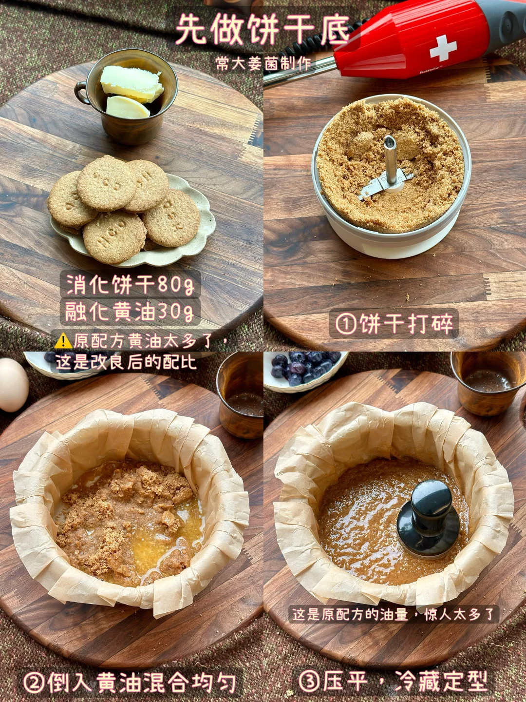 这是一款我会反复做的蛋糕, 口感递进丰富,hin绝~ 🫐蓝莓果子熬制的果酱层和🧀奶酪交相呼应,二者是甜品里的绝佳搭配~ 最后,饼干底是画龙点睛之笔,赋予蛋糕浓郁的坚果粗粮的香气,完美闭环。