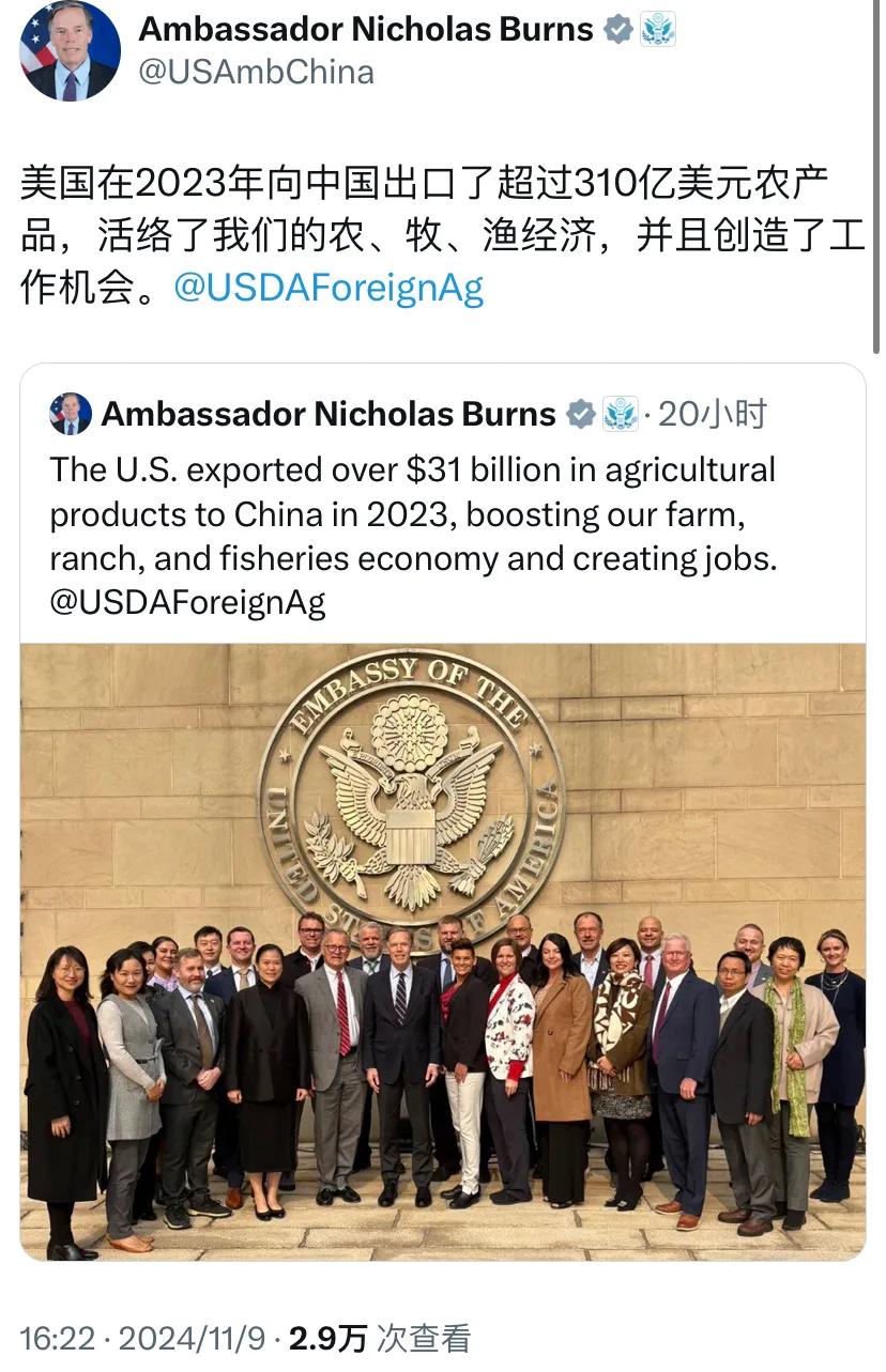 美国驻华大使伯恩斯昨天(11月9日)写道:“美国在2023年向中国出口了超过310亿美元农产品,活络了我们的农、牧、渔经济,并且创造了工作机会。” [机智]评几句:合则两利,斗则俱伤。互惠互利、共同繁荣不好吗?但是美国为了护持霸权地位,一直秉持零和博弈的冷战思维,将中国设定为“最重要的地缘政治对手”,认为中国有能力且有意愿改变现有国际秩序。实际上,中国对中美关系一直持积极开放的态度,我们一直强调“中美各自的成功是彼此的机遇”。特朗普上台后,伯恩斯也该回去了,对于未来的中美关系,只要我们自己保持稳定和发展,我们有能力迎接各种挑战。