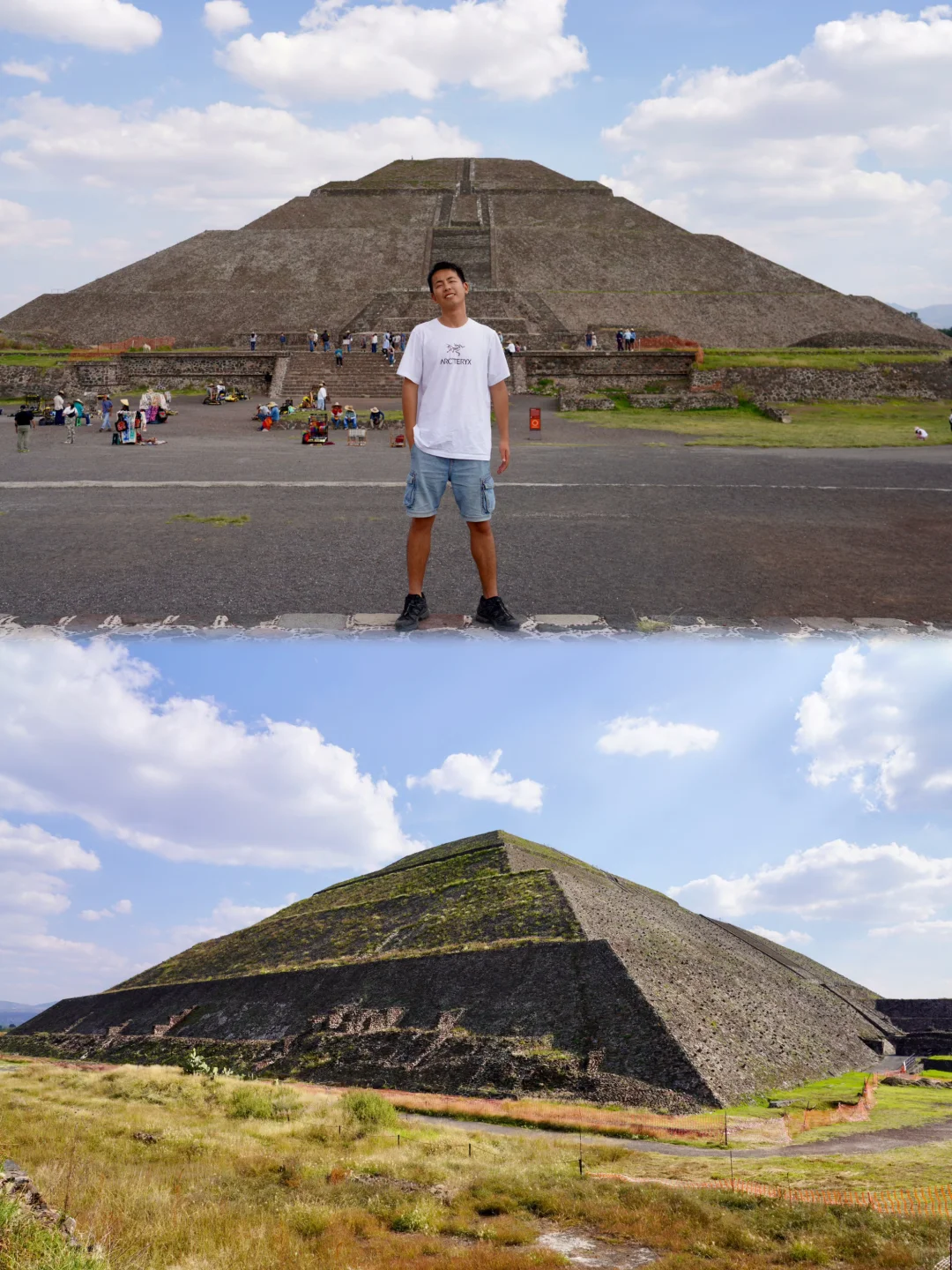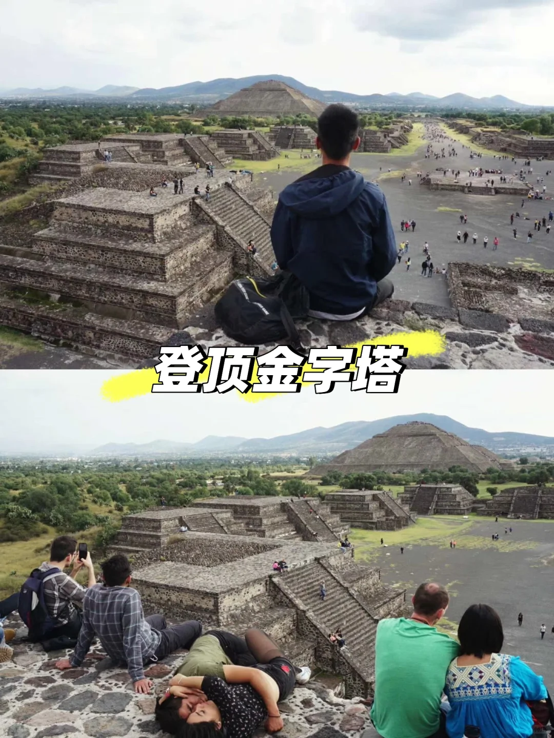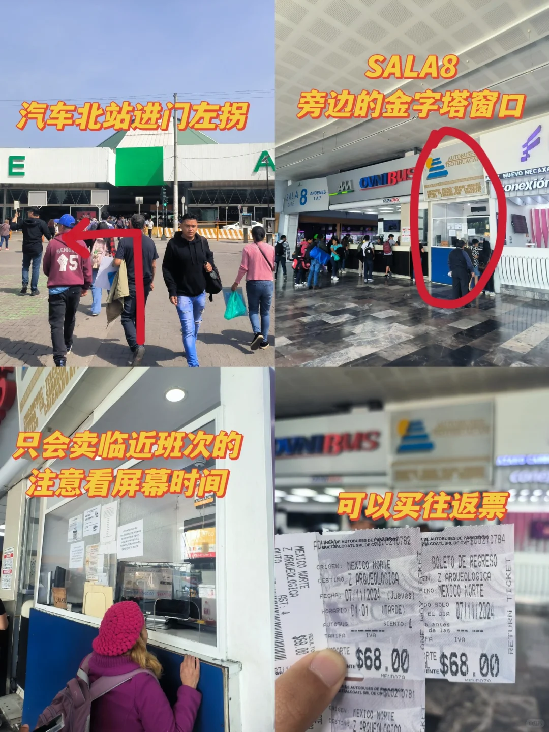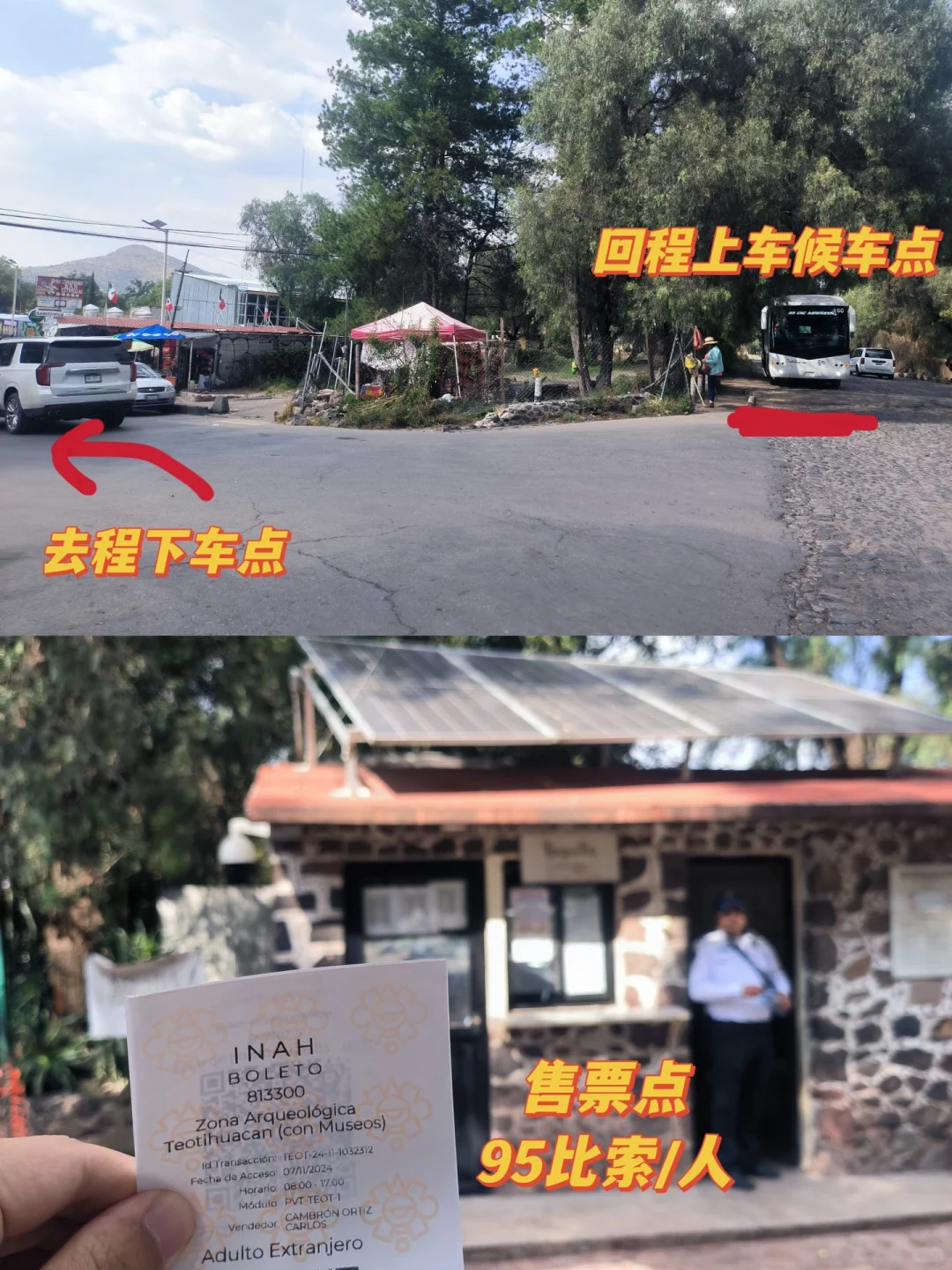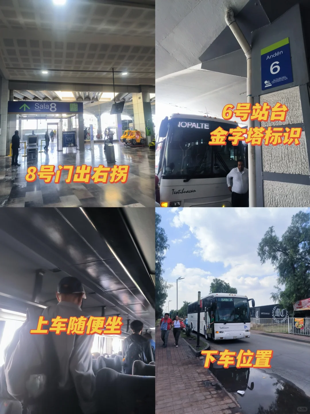 来了更后悔! 特奥蒂瓦坎金字塔指的就是墨西哥城附近的太阳金字塔和月亮金字塔。 特奥蒂瓦坎是古代墨西哥中部最重要的城市之一,如今遗留下来的文物中最知名的就是两座金字塔—太阳金字塔&月亮金字塔。 📍特奥蒂瓦坎遗址位于墨西哥城外东北方向,从墨西哥城中心出发大约 1 小时车程。 🚌关于交通 1️⃣ 在 Central de Autobuses del Norte(汽车北站)有巴士直达,15 分钟一趟车,目前票价 68 比索/人。 售票窗口如图 7,进汽车北站口后左拐走到尽头,就在 SALA8 右侧,招牌有金字塔标识。 候车站台从 SALA8 走出后,6 站台就是,同样有金字塔标识。 上车后座位随机,不需要按照票面座位入座。 这趟车中间会经过一些站点,会有人上下车。 Google 地图有时候推荐你在路边上车的位置就是在沿途站点,价格比车站买便宜,但是找位置麻烦。 下车位置如图 8,下车后往前走 100 米就是售票处。 2️⃣直接打车,Uber 或 DiDi 都可以,单程价格约 500 比索,3-4 个人就是比较划算的。 ➡️关于回程 你可以在汽车站买好往返票,也可以在回程的时候付钱给司机。 回程上车位置就在下车位置附近,看到车直接上就可以了。 建议在 Indios Verdes 下车,可以体验墨城的缆车🚡交通,可以欣赏日落🌄,深入平民区,独一档的体验。 🎫门票及向导 目前门票 95 比索/人,我是从太阳金字塔这侧入口进入,沿途只碰到一个英文向导。 ✅游览感受 这是我第二次来特奥蒂瓦坎,2020 年以前两座金字塔都是可以攀爬的,登顶后可以看到遗址全貌,颇有一股一览众山小之感。 现在禁止攀爬,对于那些对历史没那么感兴趣的朋友来说,可能有一点点不值。 同行的朋友是第一次来,直言“不来后悔,来了更后悔”。 ⚠️注意事项 做好防晒措施,尽量避免正午到达景区,因为游览全程无阴凉区域。 下午四点钟左右抵达,光线相对柔和,逛起来舒服,拍照也容易出片。 🚻洗手间位于月亮金字塔左侧的纪念品街道。