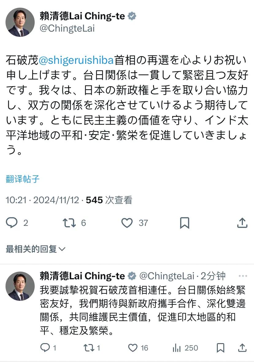 赖清德刚刚(11月12日10:21)用中文和日文写道:“我要诚挚祝贺石破茂首相连任。台日关系始终紧密友好,我们期待与新政府携手合作、深化双边关系,共同维护民主价值,促进印太地区的和平、稳定及繁荣。” [机智]评几句:民进党当局继续“倚美谋独”策略的同时,也不断寻求与日本之间的紧密关系。实际上,民进党政治生态中存在着明显的“媚日”倾向,这一倾向不仅影响其政策选择,还深入其政党理念和日常运作中。整体来看,民进党是个既亲美又媚日的政党。
