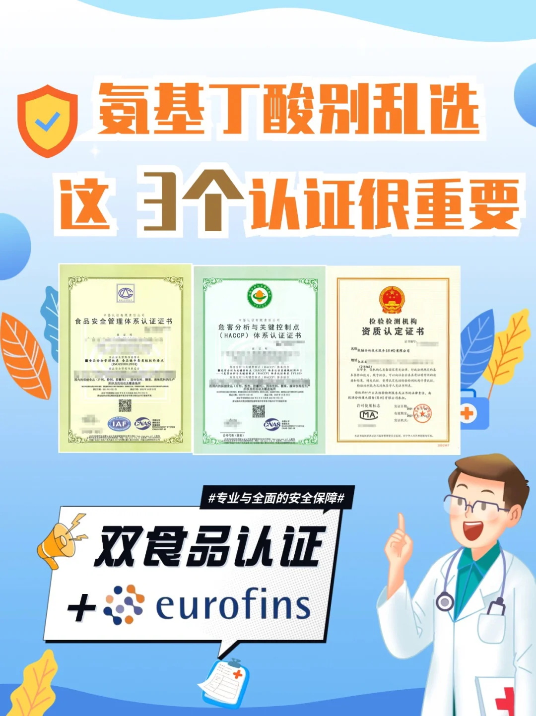 为了确保选择的氨基丁酸产品既符合安全标准又具备出色的品质,以下三个认证显得尤为重要:双食品认证(包括HACCP和ISO22000)以及Eurofins认证📄