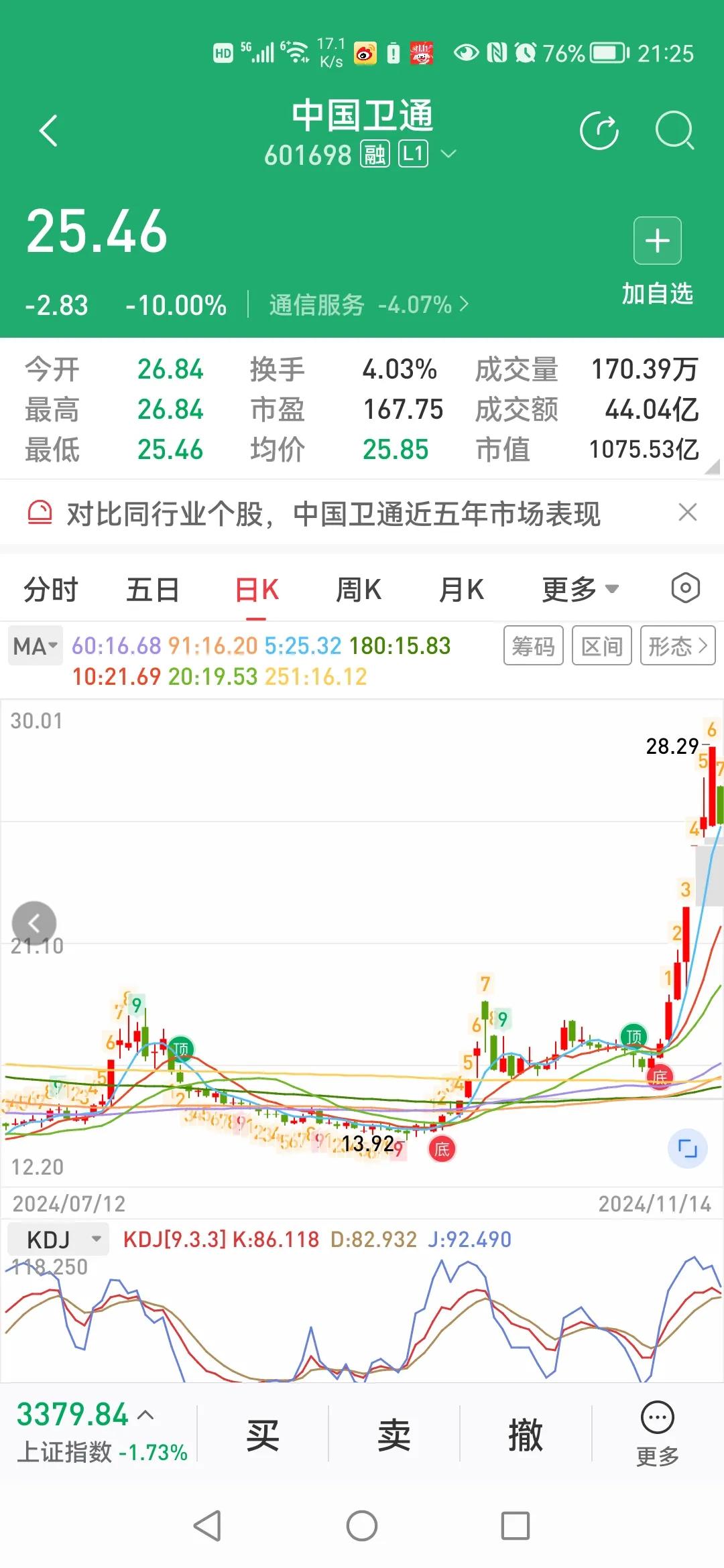 中国卫通,我看市值比较大,没我买,千亿市值的股票,居然涨得这么猛!