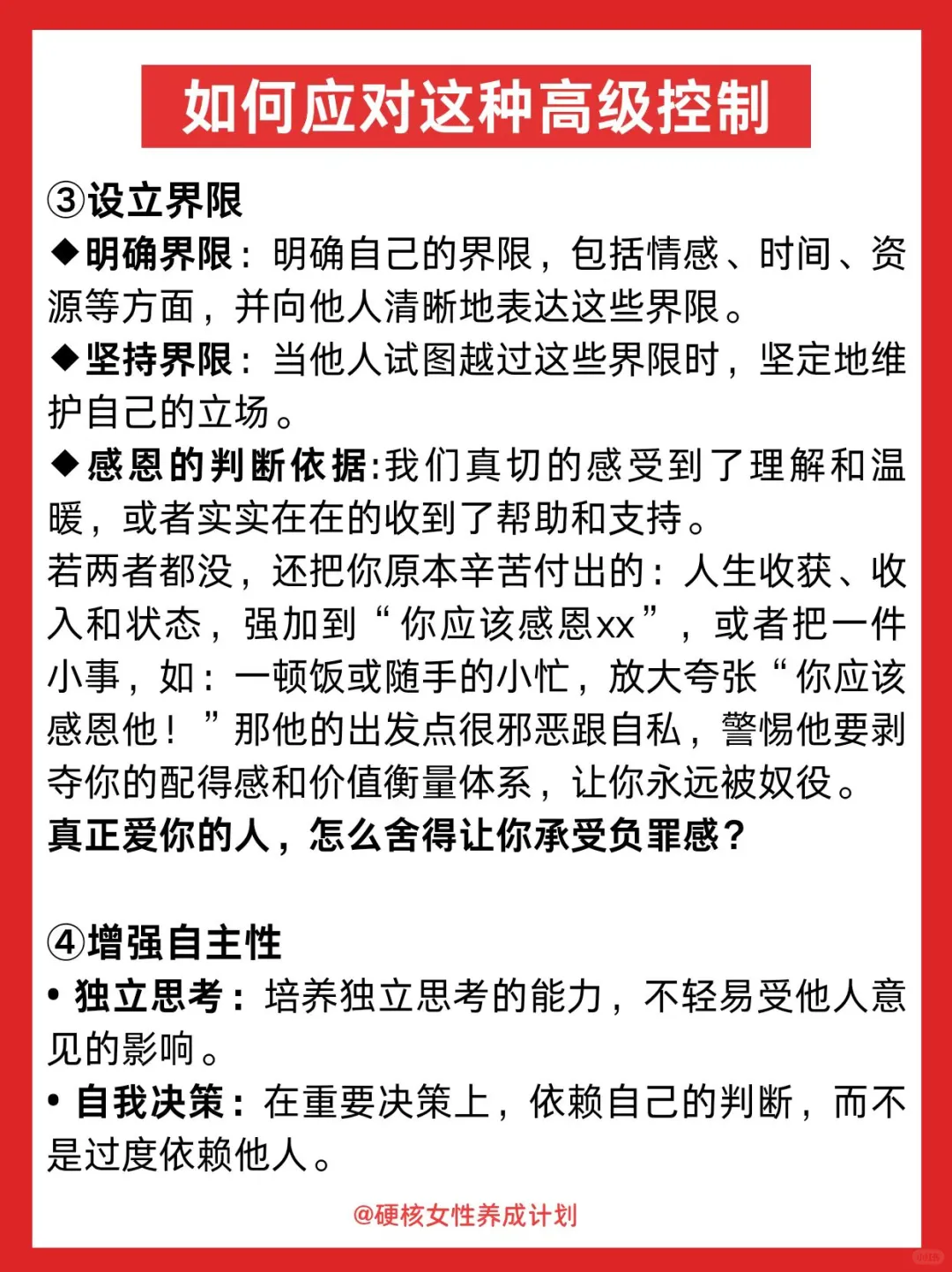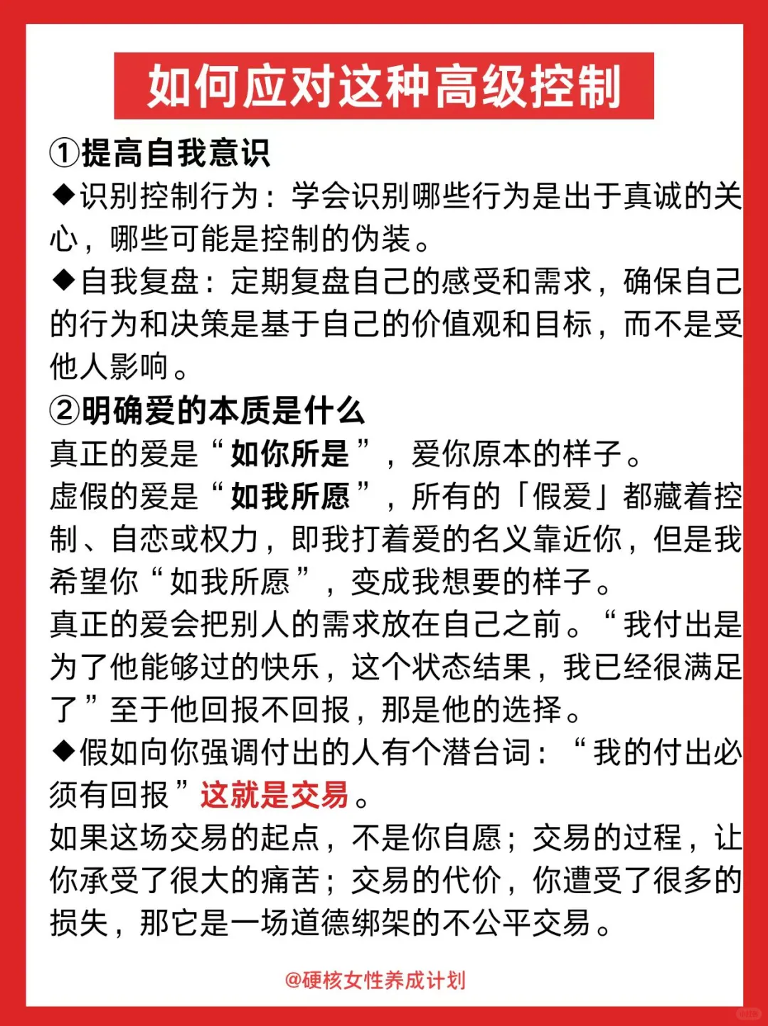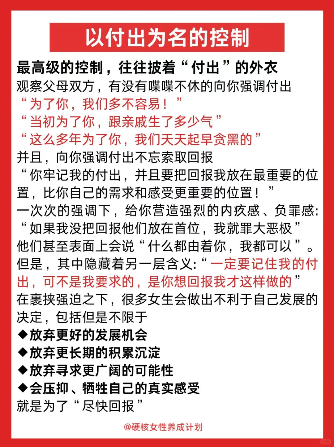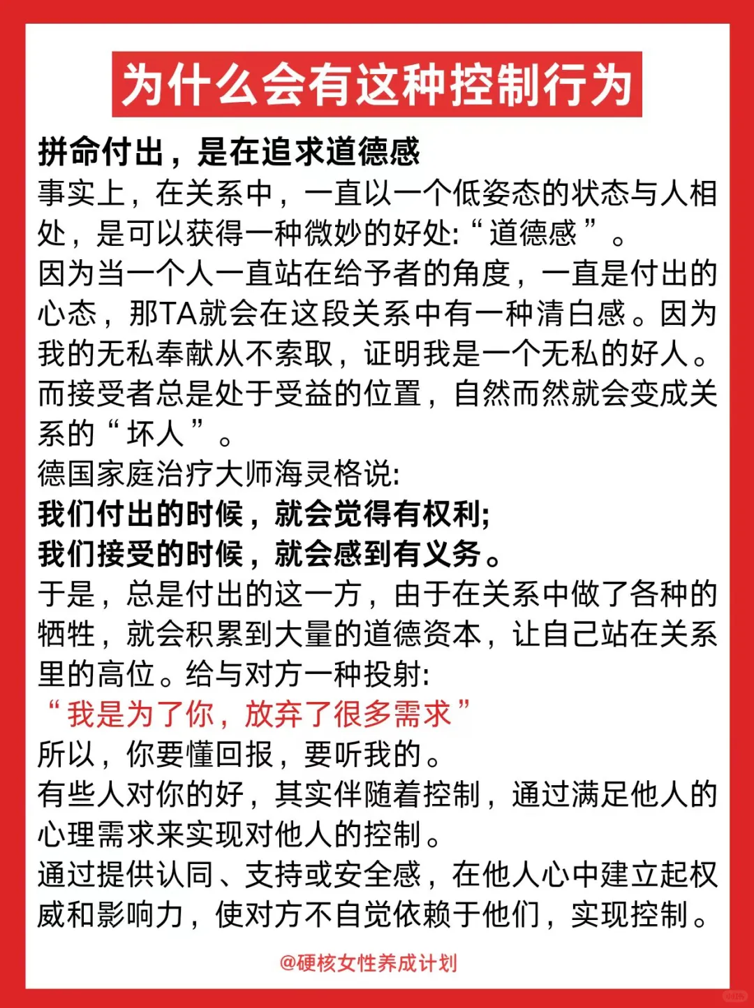 隐形控制从不只是一种形式,有条件的“爱”更像无形的枷锁,过度付出的背后都是控制,女生要想过得好,一定要远离向你强调付出跟牺牲的人。当然,自己也不要成为过度付出者。