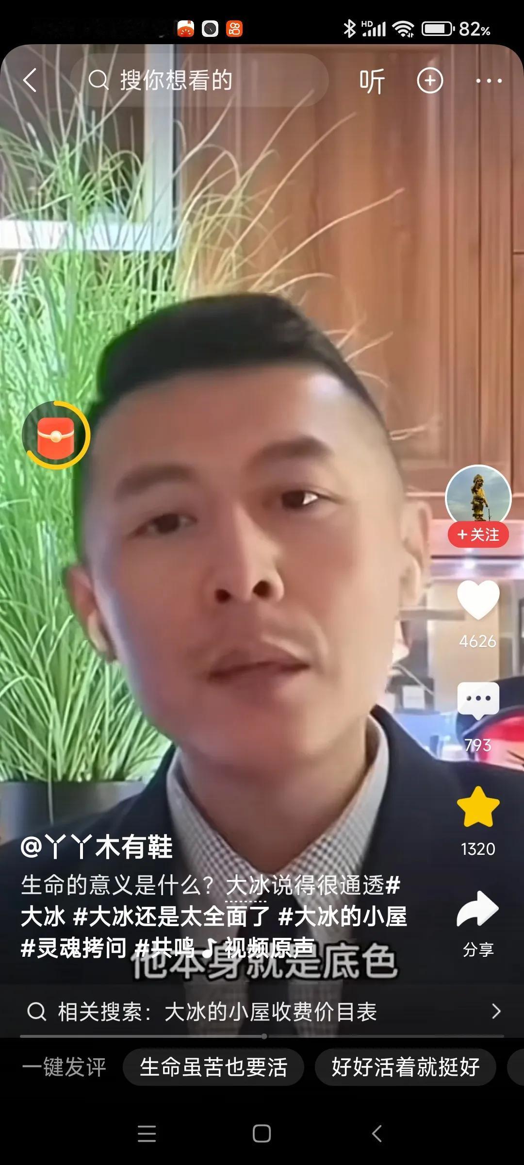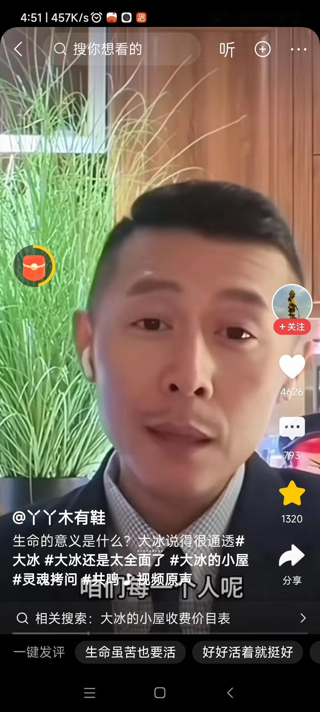活着的意义 早上起来,刷到的第一个视频是大冰老师的,在视频里大冰老师回答了他对生命的意义,让我心头沉重一击。 现在抄录视频里的原话,大冰说:“老有人问,生命的意义是啥?我告诉你,没啥意义,就俩字“活着”。咱每个人,一生下来都是向死而生的。这场生命呢,它本身的底色是悲凉也是充满了磨难痛苦。生如逆旅单行道,哪有岁月可回头呢?但是,总要好好活着啊。” 听完这段话,让人醍醐灌顶,他没有说生命的意义在于活得有价值,活得潇洒,活出自我,那些高大上的话,就两个字“活着”,他在四十几岁的年纪,他善解人意,洞明世事, 关于活着,余华在他作品《活着》中也说道:“人是为活着本身而活着的,而不是为活着之外的任何事物所活着。”很多事情,不是因为有意义才要去做,而是你做了它才有意义。 生活本就充满了伤感和磨难,何苦再去自我为难呢?正如大冰老师说,生如逆旅单行道,哪有岁月可回头,人生一世,草木一秋,没有回头路的,要想让活着有意义,就是好好活着。