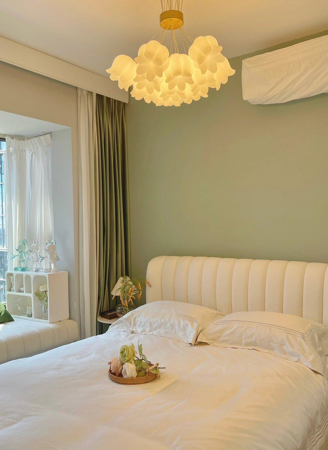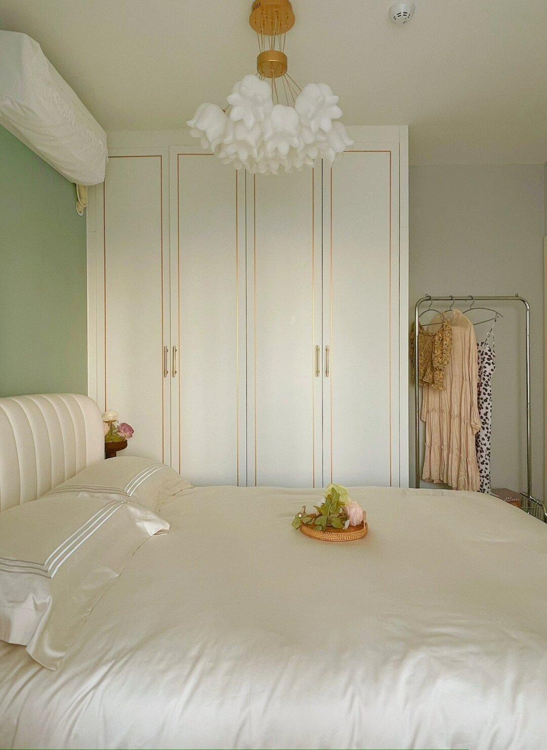 关于软装搭配 四件套:给卧室换了个珠光白的四件套,颜色太温柔了~敲适合夏天,质感很高级,睡起来丝丝滑滑的hin舒服~ 窗帘:颜色我选的是橄榄绿拼米白,跟墙漆颜色和整体风格太搭配啦~ 床:1.5白色的双人床,靠背软软的很有安全感,使用两年暂时没有变黄痕迹。 床头柜:除去床和衣柜的空间,两边都只能放得下30cm的床头柜,这种缝隙床头柜刚刚好~ 卧室灯:搭配整体的风格选了铃兰灯,铃兰花的造型清新又雅致。