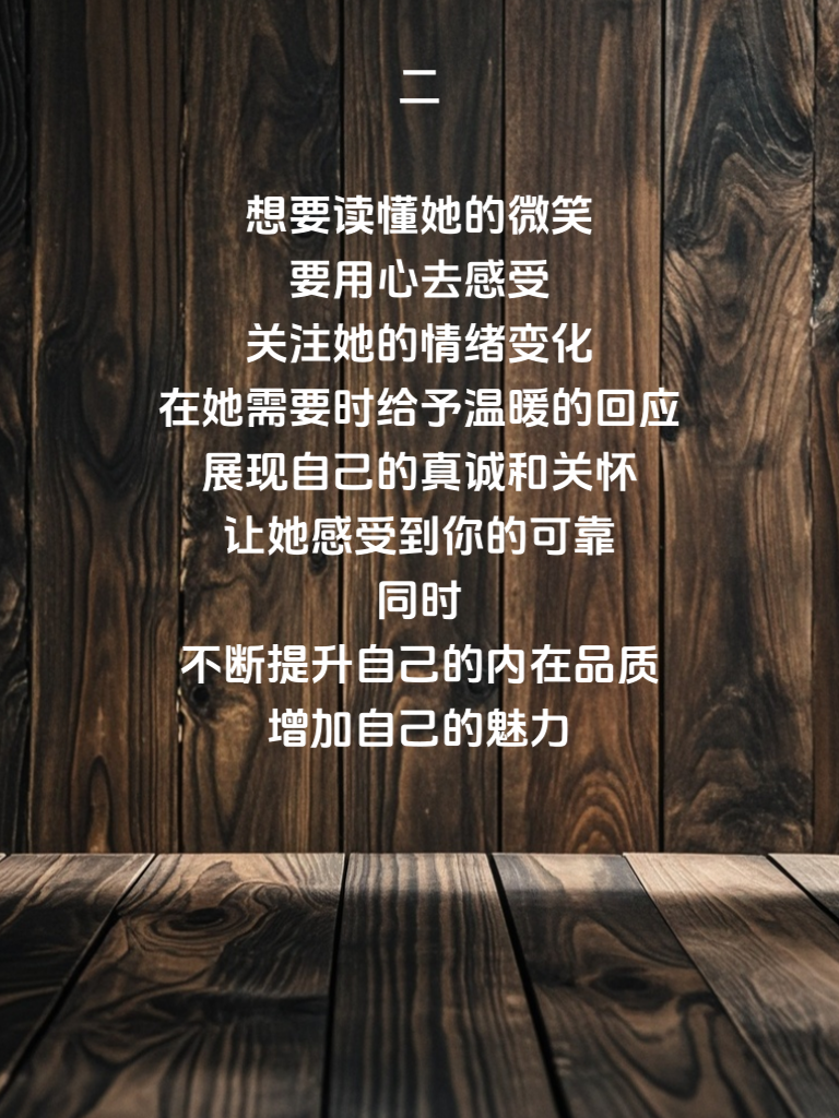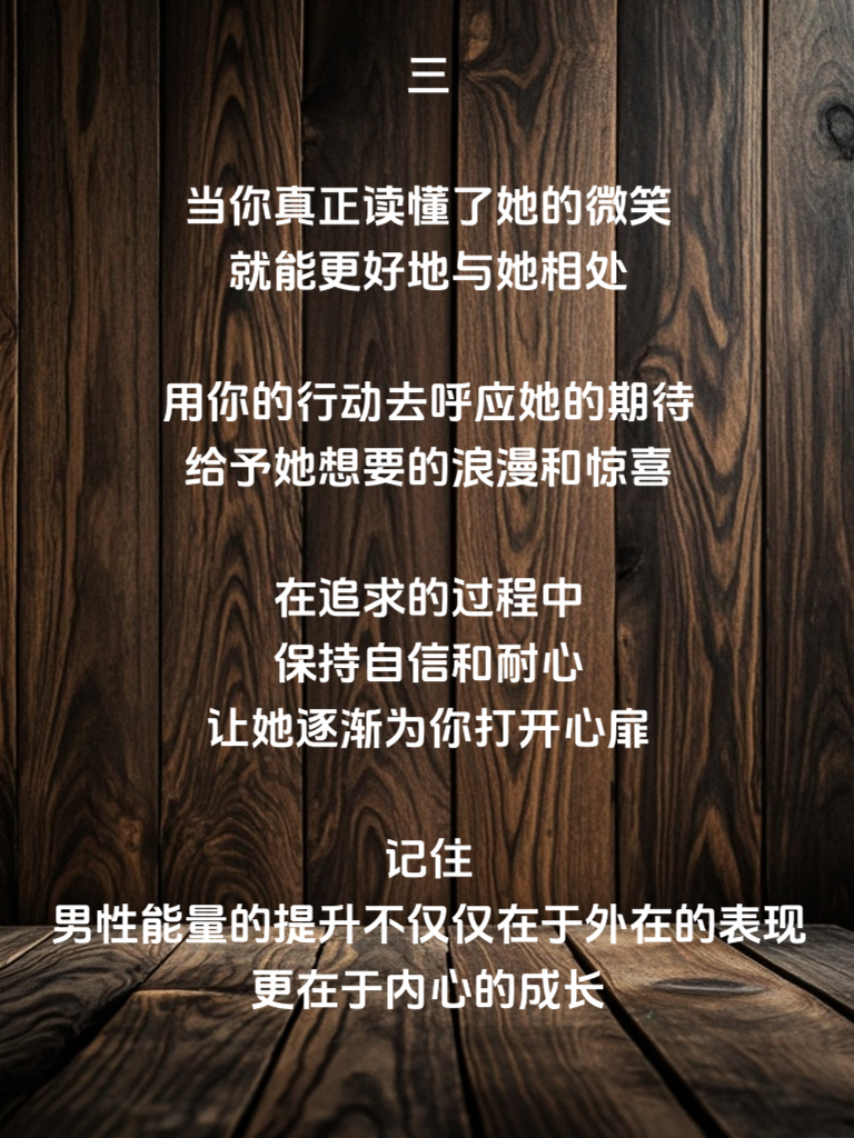 一,女人的微笑如同神秘的密码,蕴含着她们内心的情感世界。读懂她的微笑,是提升男性能量的关键第一步。每个微笑都有不同的含义,可能是开心,可能是期待,也可能是暗示。男性要学会敏锐捕捉这些细微之处。 二,想要读懂她的微笑,要用心去感受。关注她的情绪变化,在她需要时给予温暖的回应。展现自己的真诚和关怀,让她感受到你的可靠。同时,不断提升自己的内在品质,增加自己的魅力。 三,当你真正读懂了她的微笑,就能更好地与她相处。用你的行动去呼应她的期待,给予她想要的浪漫和惊喜。在追求的过程中,保持自信和耐心,让她逐渐为你打开心扉。记住,男性能量的提升不仅仅在于外在的表现,更在于内心的成长。