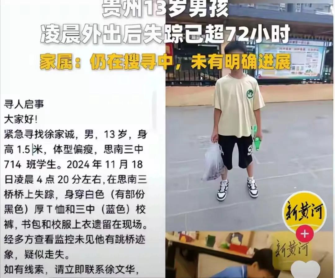 十三岁少年失踪之谜:13岁男孩每天3点起床背书,勤奋背后的隐忧 在贵州铜仁的一个普通家庭里,有一位年仅 13 岁的初一男孩,他的生活轨迹本应是充满阳光与希望,然而,近日发生的事情却让整个家庭陷入了深深的阴霾之中。 这个男孩一直以来都是众人眼中勤奋刻苦的典范。每天凌晨 3 点,当整个城市还沉浸在梦乡之中,他的闹钟便会准时响起。没有丝毫的拖沓与犹豫,他轻手轻脚地起床,生怕惊扰了仍在熟睡的父母。随后,他独自准备简单的早餐,吃完便匆匆踏上前往学校的路,只为能多一些时间在学校背书。 11 月 18 日,这看似平常的一天,却成为了全家人的噩梦开端。男孩如往常一样,凌晨 4 点准时出门前往学校,他家与学校的距离不过短短 10 分钟的路程。然而,上午 8 点,老师的一通电话打破了平静,男孩并没有像往常一样出现在学校。 心急如焚的父亲立即报警,随后,在一座名为思南三桥的桥上,人们发现了男孩的书包和校服外套,可他本人却踪迹全无。打捞人员在周边水域展开了长达 1 天半的仔细搜寻,却一无所获。监控录像显示,在 4 点 21 分时,男孩曾在街边吃东西,可之后他去了哪里?又遭遇了什么?一切都是未知数。 据父亲透露,男孩曾向他倾诉过学习压力巨大。在这个竞争激烈的教育环境中,他每天都在努力追赶,睡眠时间被严重压缩,长此以往,身体与心灵的疲惫可想而知。如今,男孩已经失踪超过 72 小时,每一分每一秒的流逝都像是在家人的心口上割一刀。 有网友猜测,或许是沉重的学习压力让男孩不堪重负,选择了离家出走,找个地方暂时躲避。大家纷纷呼吁,若孩子平安归来,父母千万不要责备打骂,而是要引导他调整学习方式,重视身心健康。毕竟,他还只是一个初一的孩子,正处于身心发育的关键时期,如此高强度的学习模式实在令人心疼。 此刻,整个城市都在为这个失踪的男孩揪心,大家都在期待着奇迹的发生,盼望着他能平安归来。无论是街头巷尾,还是网络平台,人们都在持续关注着这一事件的进展,希望能有更多的线索出现,早日解开男孩失踪之谜,让他重新回到温暖的家庭怀抱,重拾那份属于他的青春与欢笑。请善待孩子们吧 18岁男孩之谜