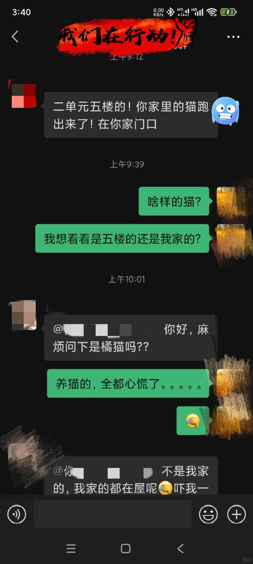 [生气R][生气R][生气R]今天刚到单位一会,业主群里有人说,五楼的猫跑出来了,在她家门口坐着呢。