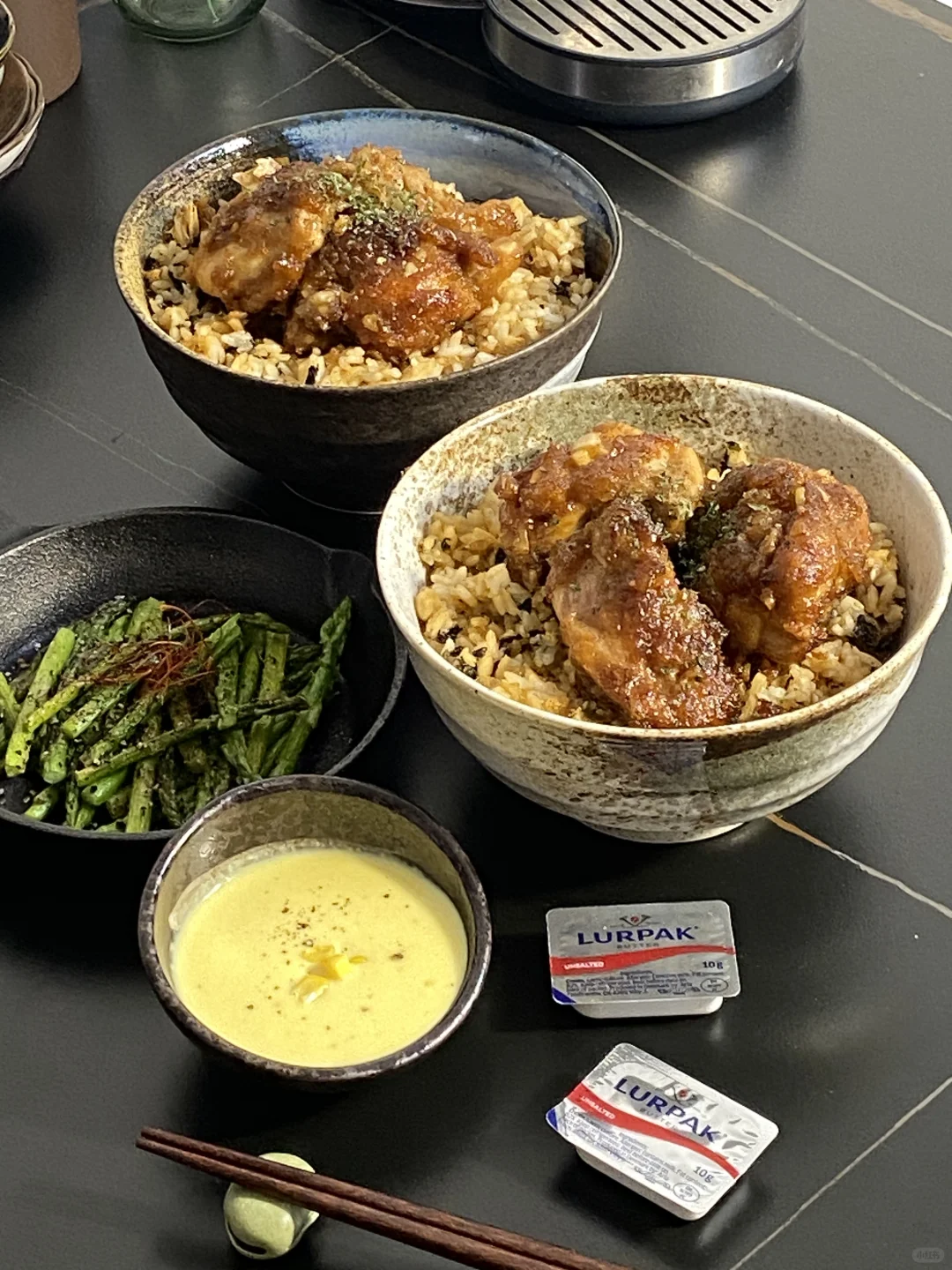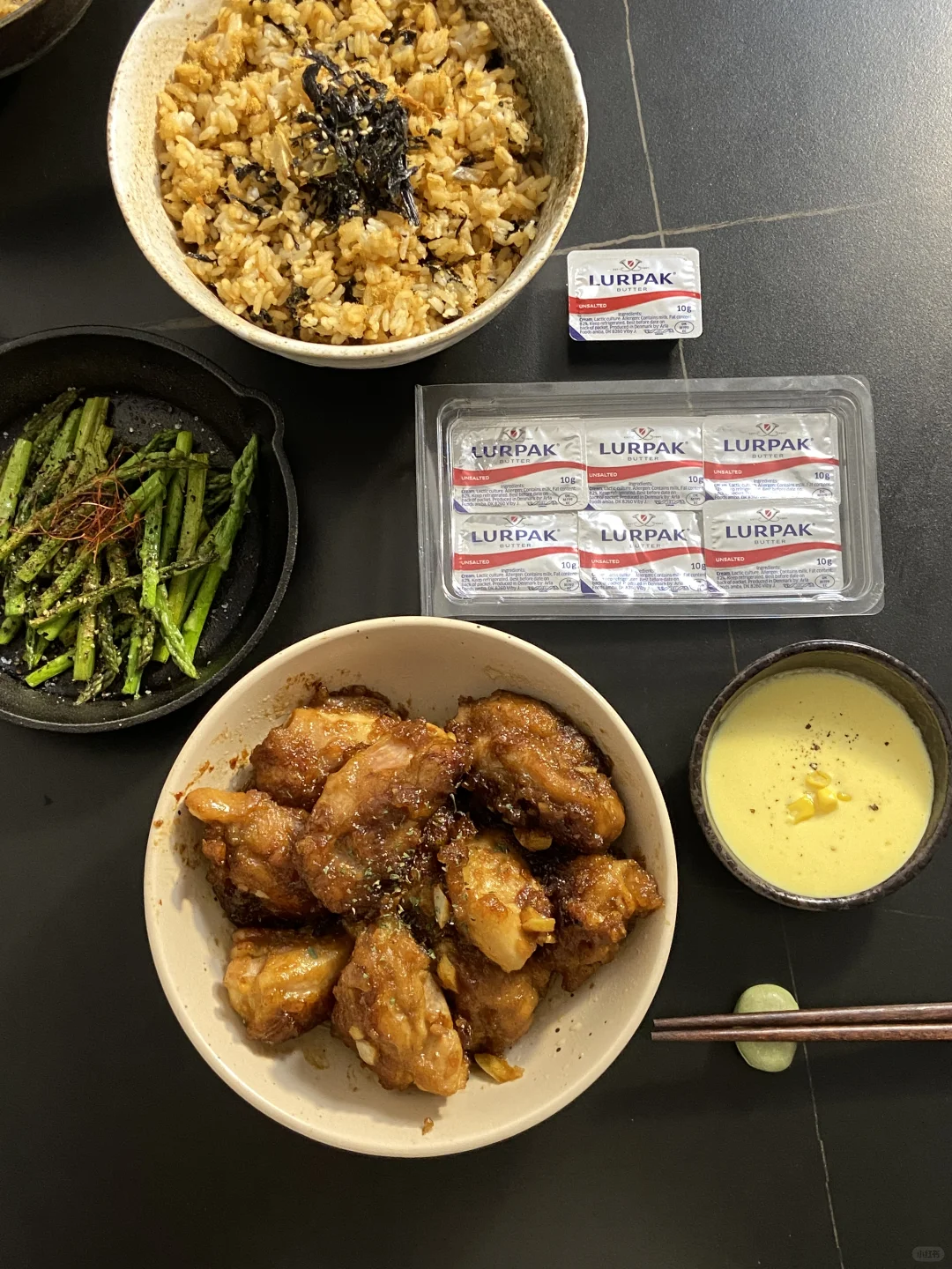 今日食谱📜黄油拌饭蒜香黄油鸡玉米浓汤🥢