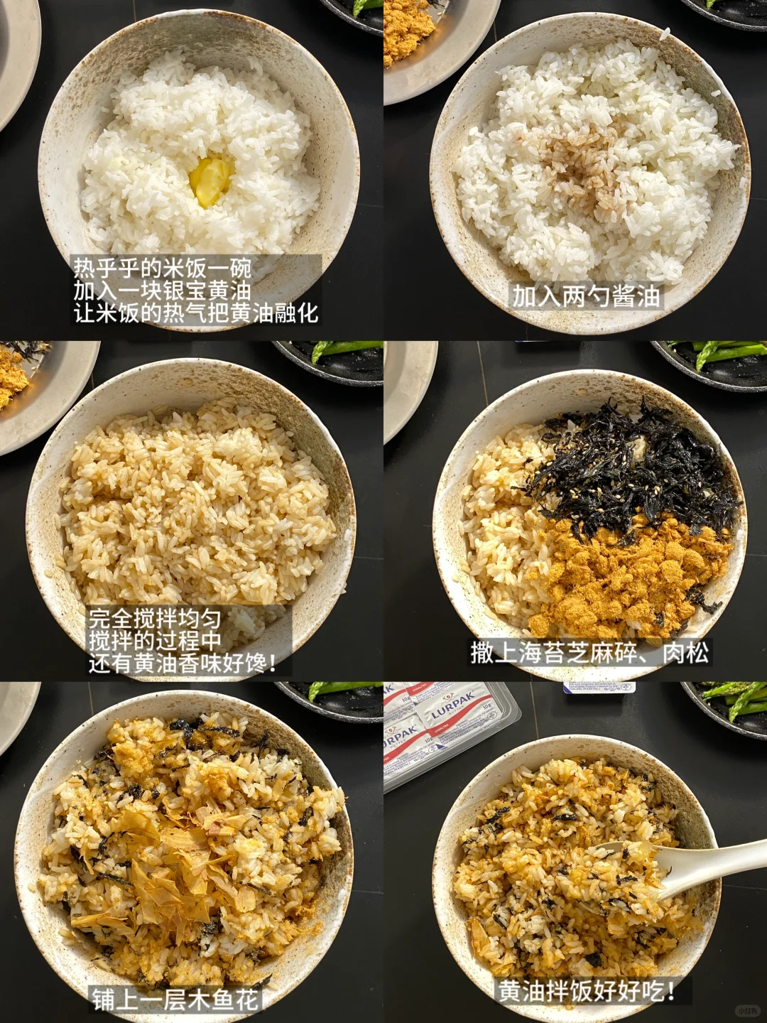 1)热乎乎的米饭一碗,加入一块银宝黄油,一定要记得选这个牌子,因为这种纯新鲜牛奶发酵的才不腻人,让米饭的热气把黄油融化,搅拌均匀