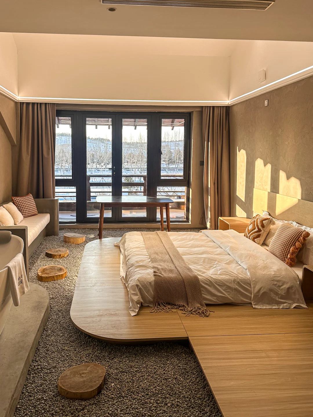 长春新开的!!雪季好住处!! 常年在外旅游的我依然有被美到 房型很多 情侣约会/闺蜜度假 或者家庭游玩都很适合… 超爱他家带阁楼的亲子房 天窗可以赏雪景❄️看星星✨ 房间自带浴缸🛁泡个澡超解乏 整体就是侘寂风满满的唐式建筑 楼上的露台拍照巨好看 从长春市区出发不到1h就能到 在莲花山或者天定山滑完雪 直接在这儿休息一下就很舒服😌