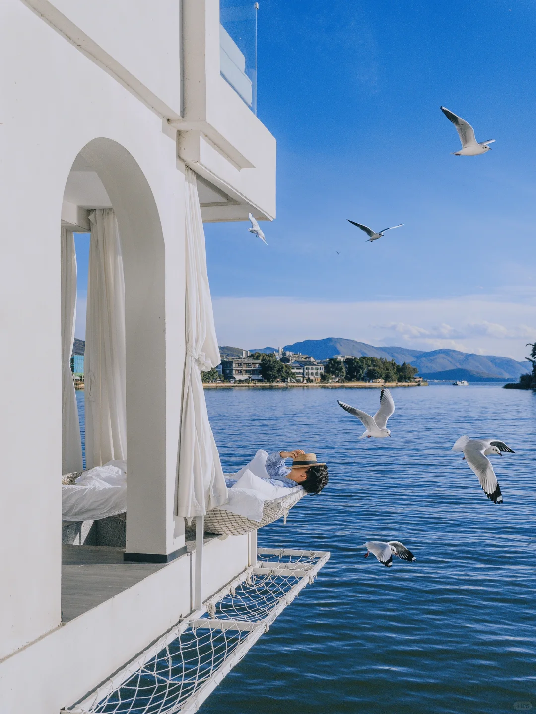 📍机位1:酒店阳台的漂浮床