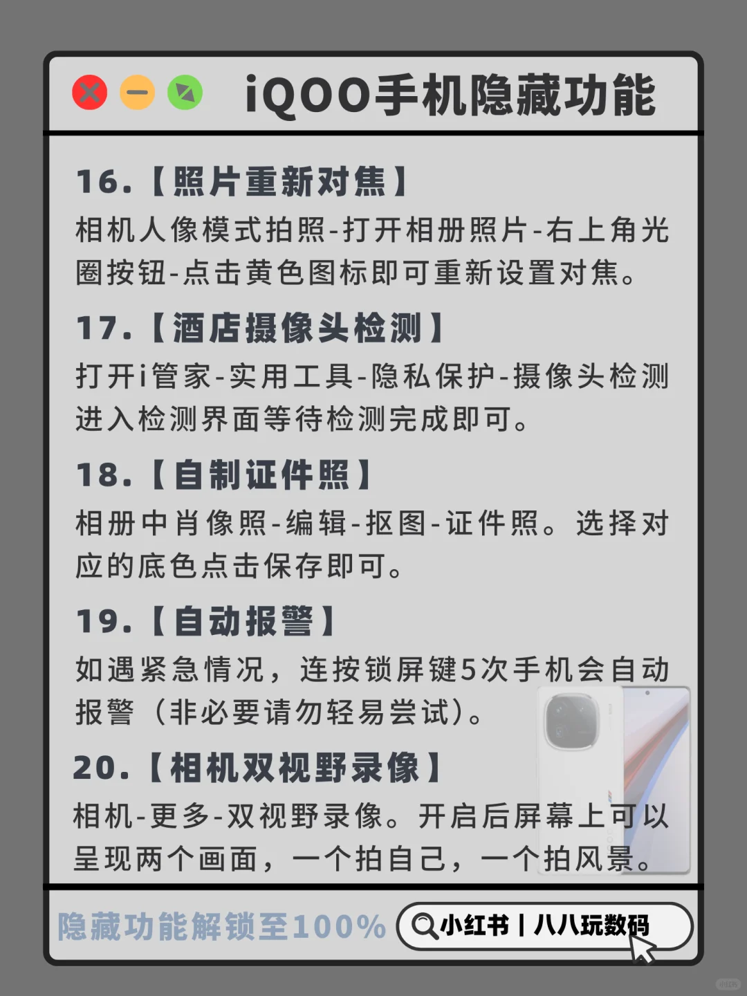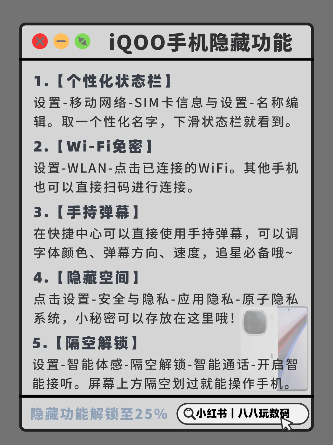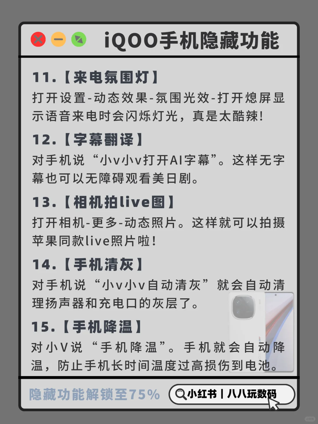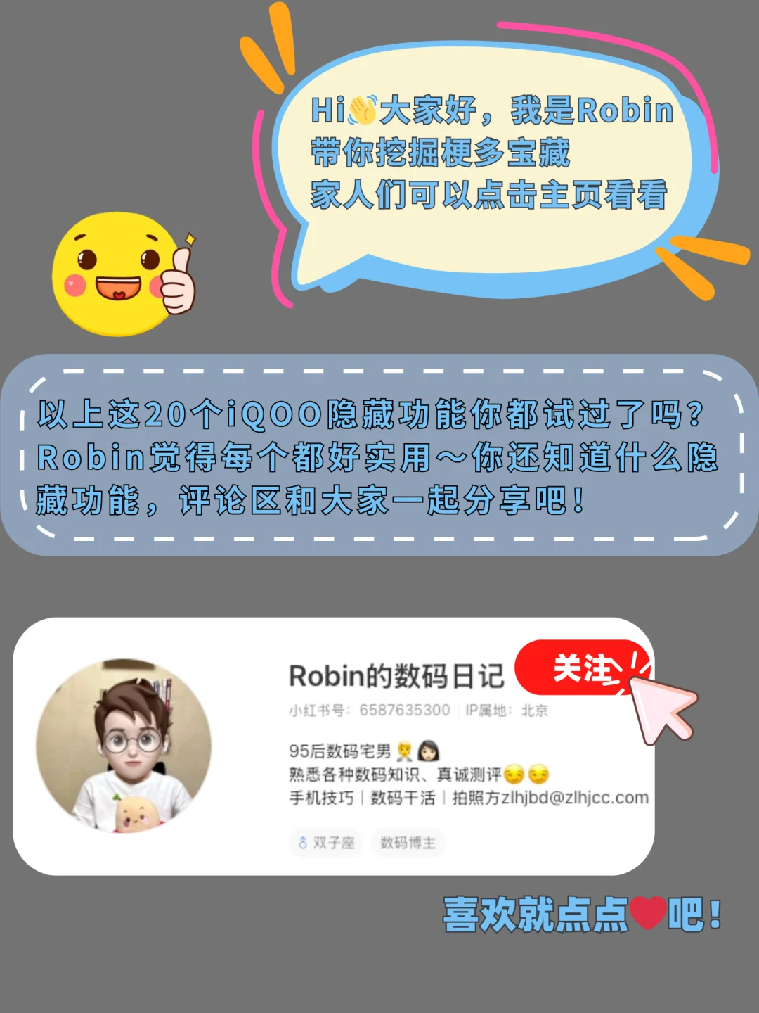 宝子们这25个iQOO手机的隐藏功能真的太实用了![吧唧R][吧唧R][吧唧R] 明明这么好用居然还有好多宝子不知道~ 今天Robin就整理分享出来。[哇R][哇R][哇R] 宝子们还有其它关于手机的问题都可以问我,我一定知无不言~[合十R][合十R][合十R]