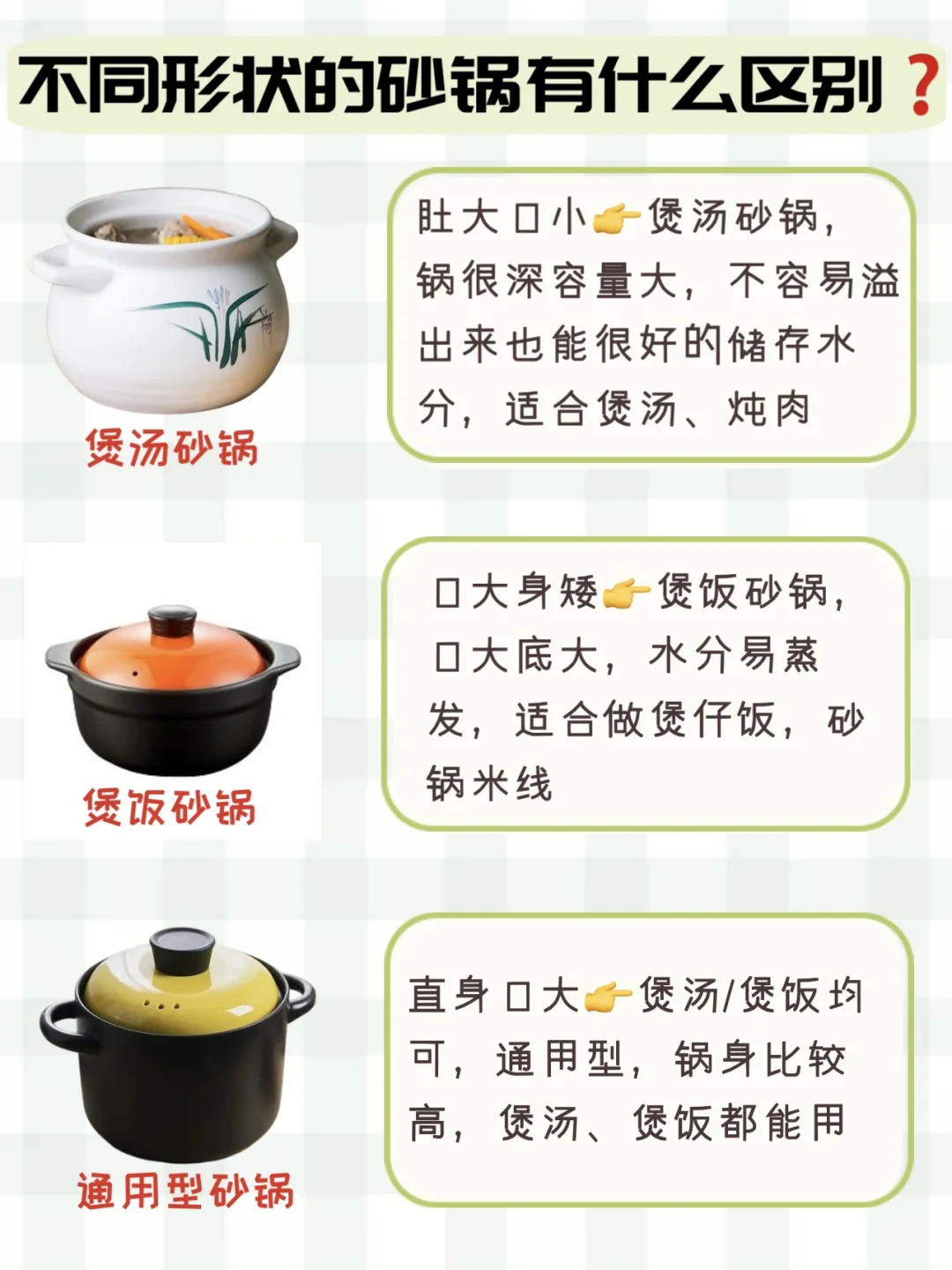 🔹口大身矮👉煲饭砂锅,口大底大,水分易蒸发,适合做煲仔饭,砂锅米线