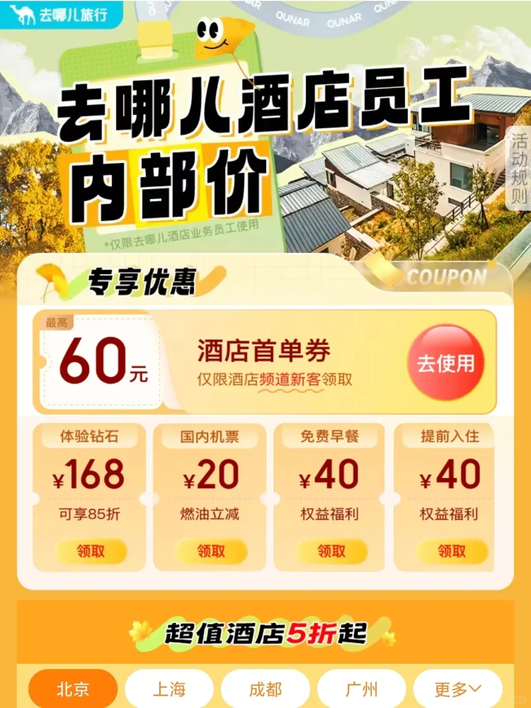 📍去哪儿:众所周知去哪儿推广的就是各种类型的优惠券,还有每天的特价酒店供人挑选。(所以去哪儿的价格一般都是比其他平台便宜的)