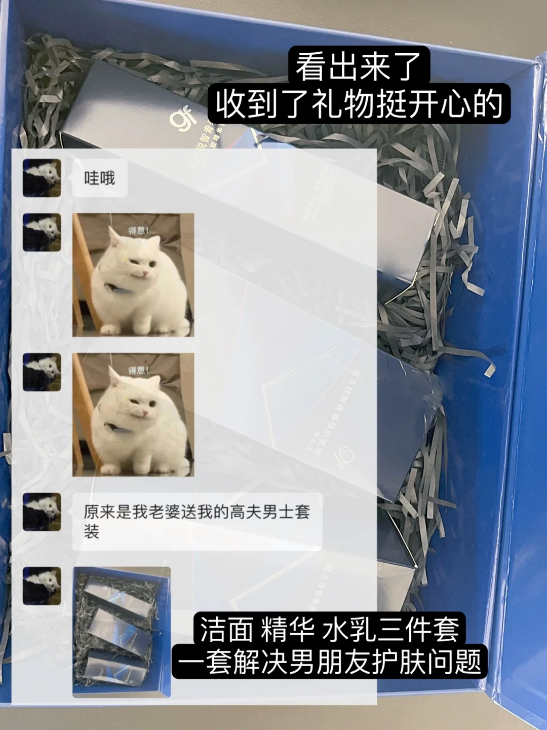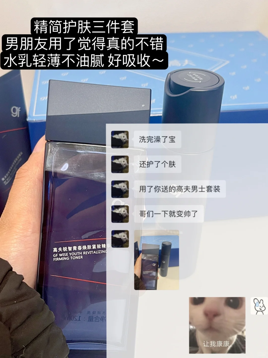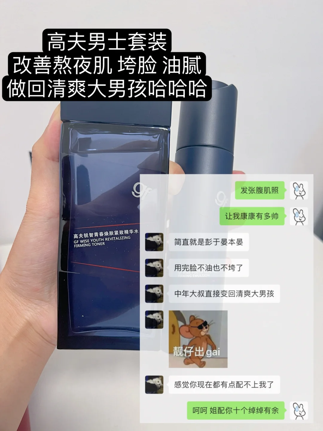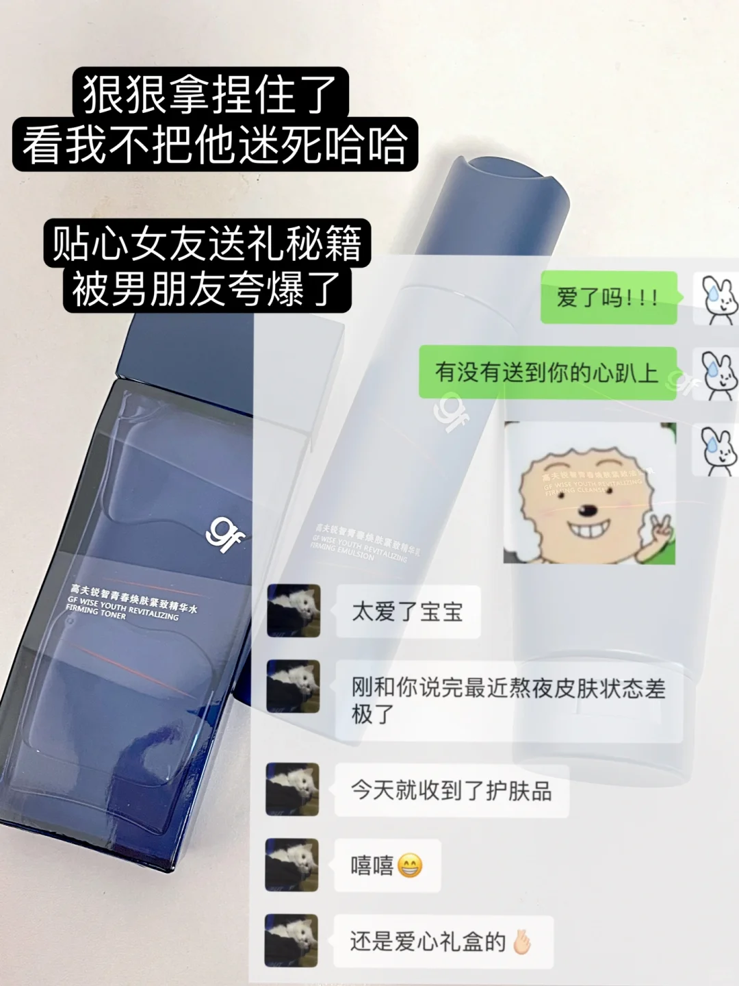 和男朋友他聊天提了一嘴 最近老熬夜加班皮肤差极了 就被我记心上了嘻嘻 这不也快圣诞了给他准备了高夫男士套装 爱心礼盒给他满满爱意 一套含洗面奶精华水加青春乳 洗面奶清爽控油洗完不紧绷 精华水补水保湿改善皮肤暗沉 青春乳质地清爽紧致淡纹雕刻下颌角 轻松搞定25+熬夜党油腻暗沉松垮问题 用完一整个清爽年下小奶狗~