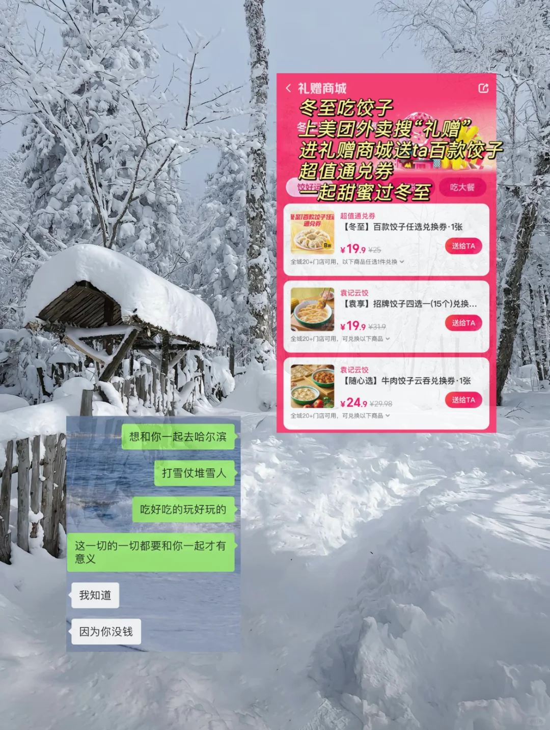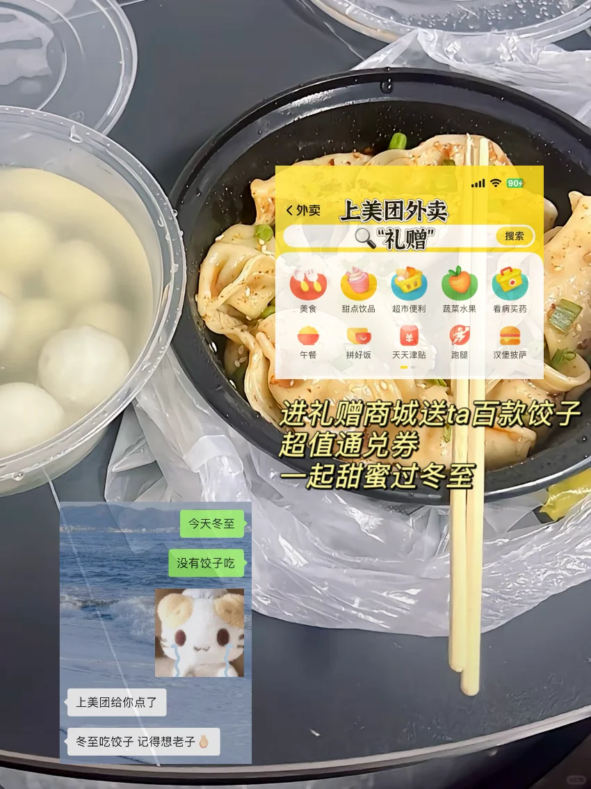 抽象姐和接梗哥的恋爱日常 晚上躲在被窝里偷偷背梗还是比不上男朋友这个天赋型选手哈哈哈哈 时间过得真快转眼就到冬至了 在忙也记得要吃饺子呀 上袋鼠团搜“礼赠”上礼赠商城抢 19.9的饺子礼赠卡! 和亲爱的他一起吃饺子