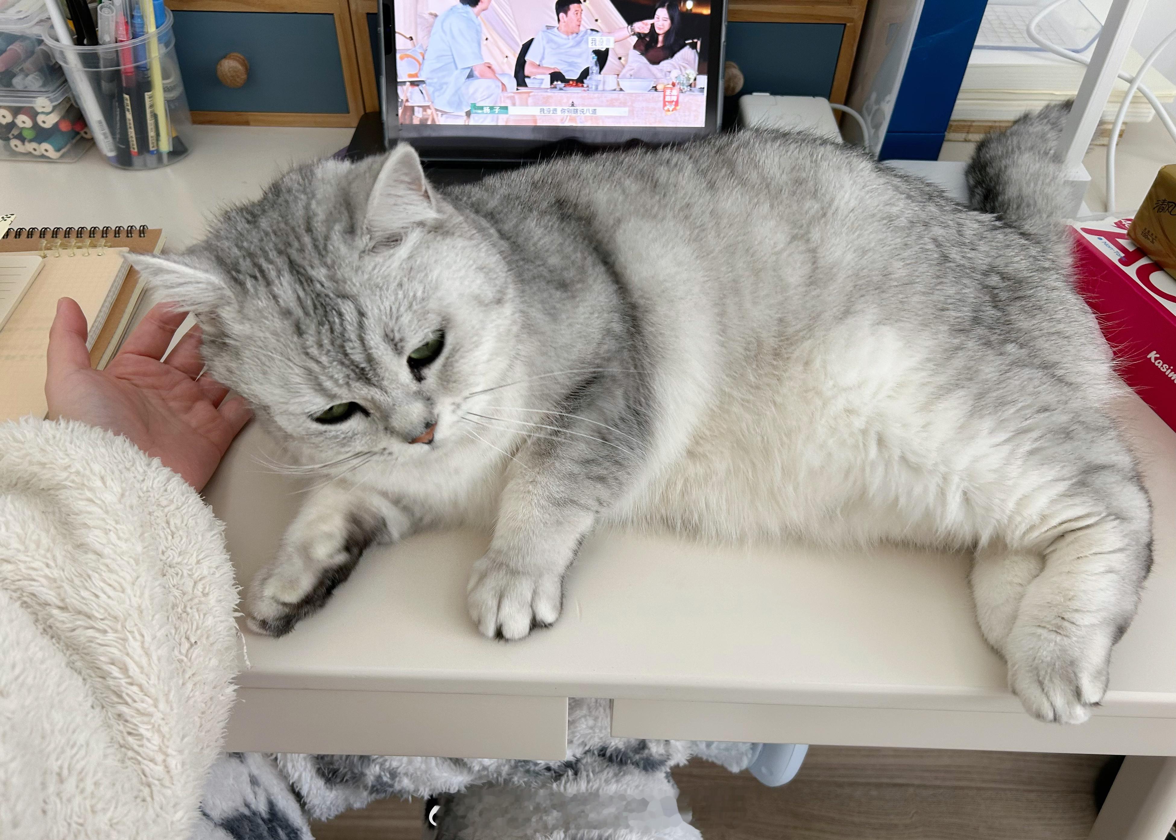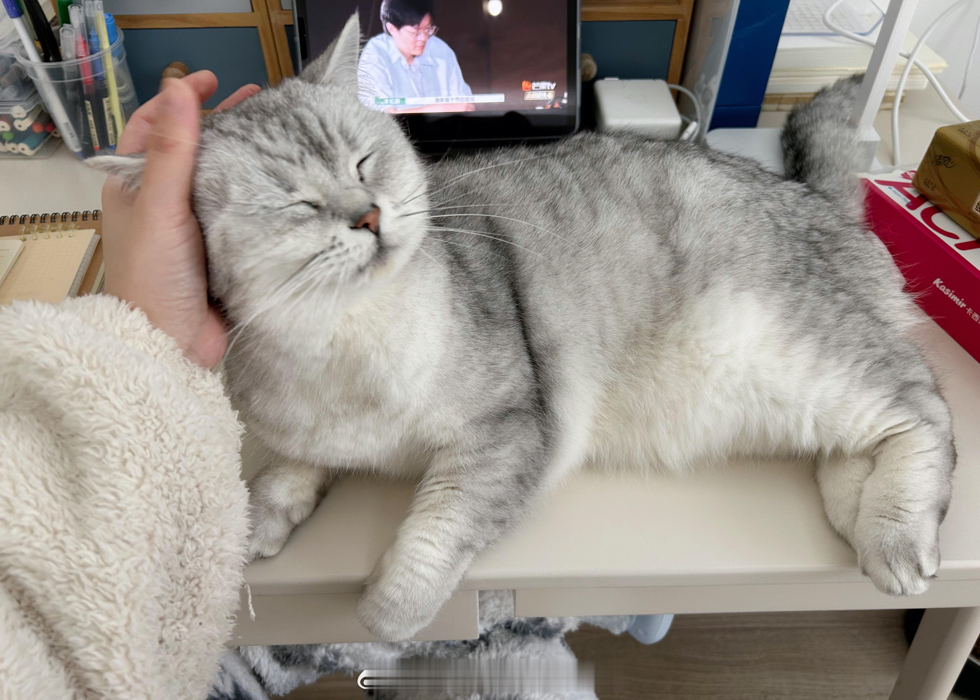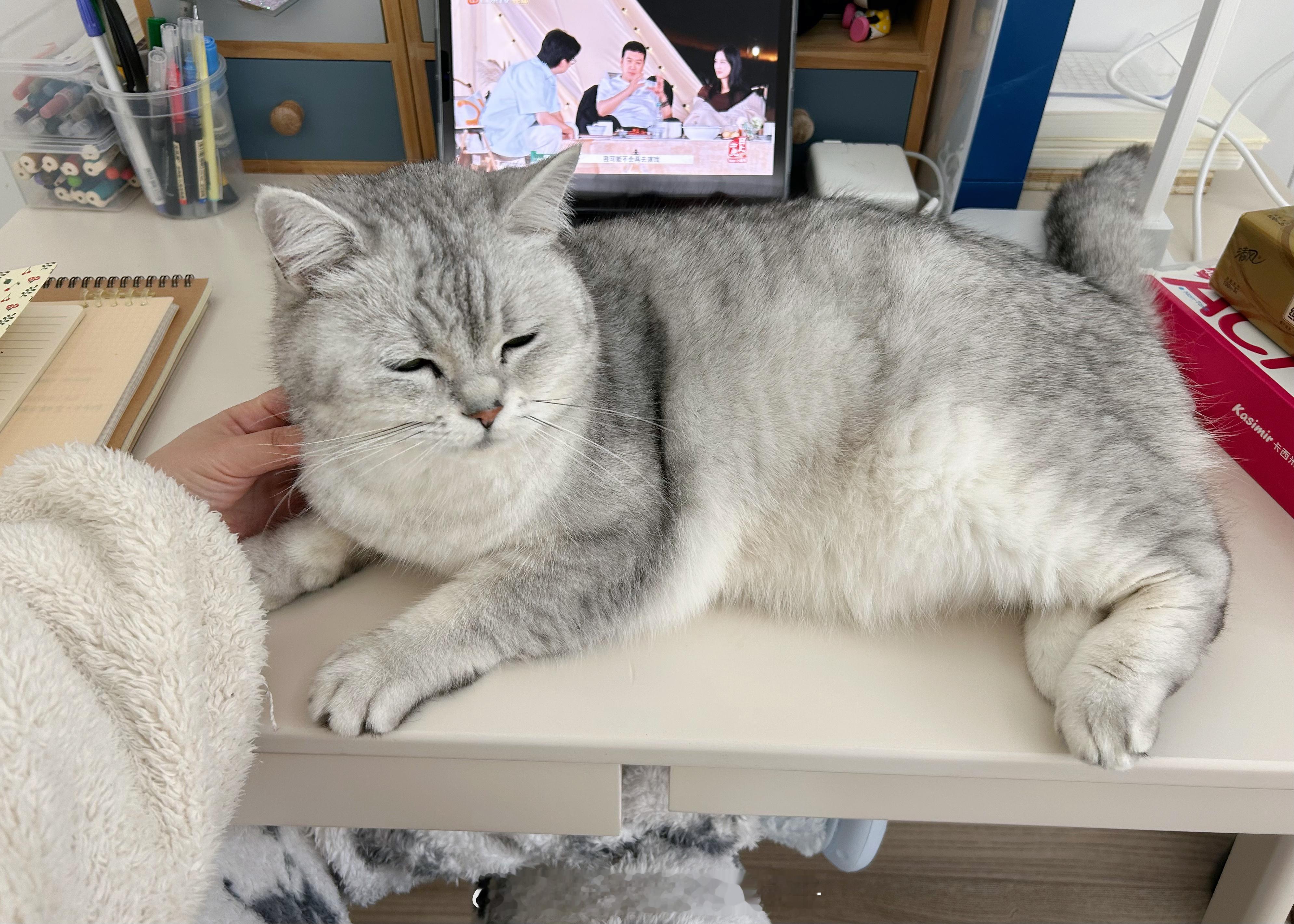 书桌上一躺就毫无空位了这一刻猫显得特别大[哈哈]