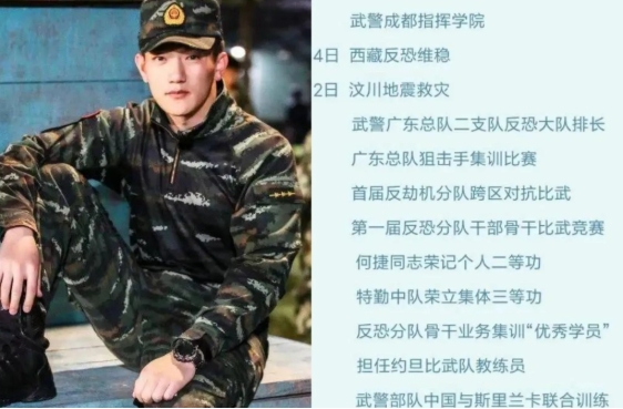 何捷可是 “军三代”,身材、长相、性格样样出众,简直就是理想型。18 岁就进了武警学院,20 岁就投身一线反恐维稳,汶川地震也有他的身影。22 岁成为特战队员,在涉毒大案中立功,得了 “岭南悍虎” 的称号。25 岁国内外反恐演习表现优异,27 岁登上天安门观礼台,29 岁提名 “中国武警十大忠诚卫士”。
