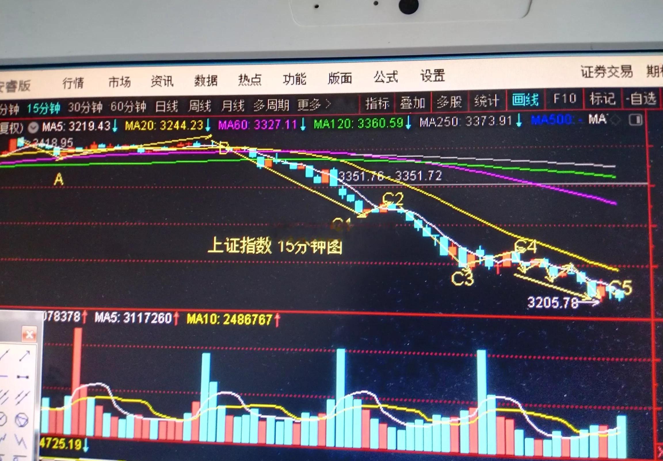 从日线级别看浪形结构,指数现己运行到C浪的主跌浪中。从15分钟图分析,主跌浪C5浪结构已出现衰竭形态。下周一就会出止跌信号,下周二或周三有可能迎来反弹,反弹后再踹一脚浪形结构才具有合理性。