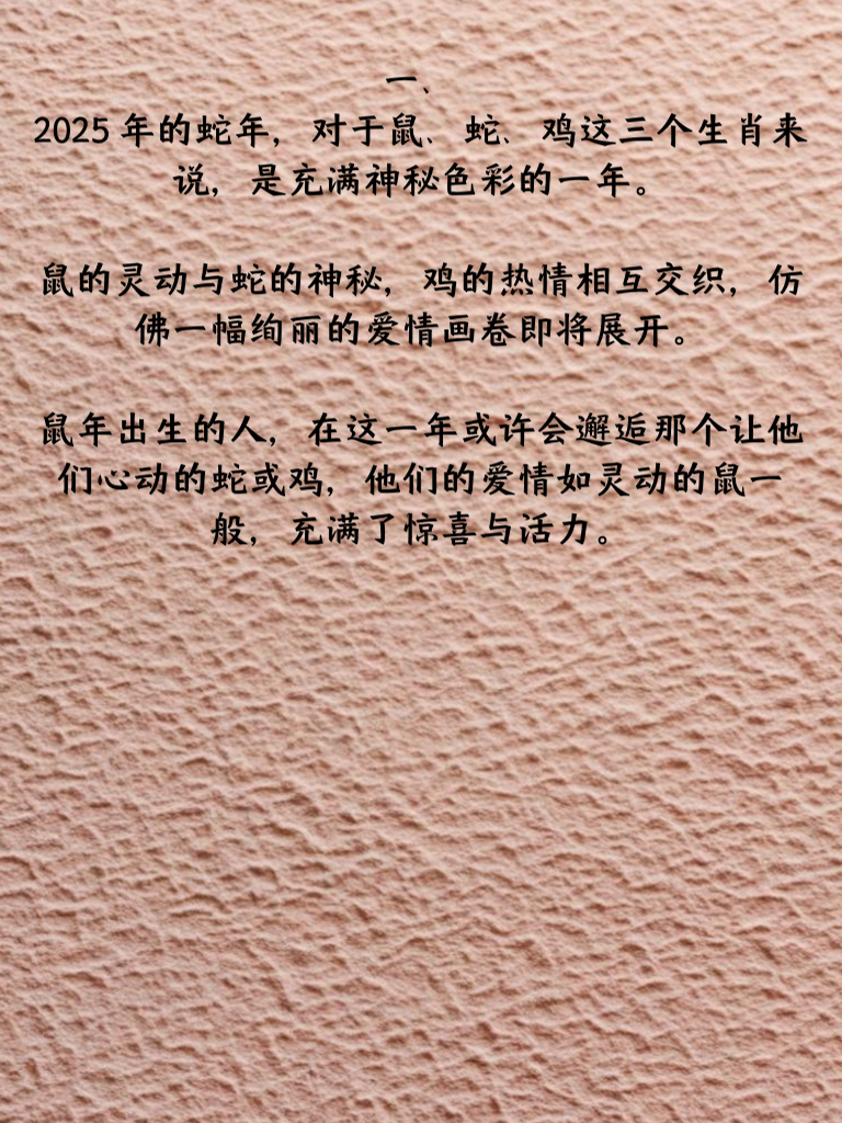 一、2025 年的蛇年,对于鼠、蛇、鸡这三个生肖来说,是充满神秘色彩的一年。鼠的灵动与蛇的神秘,鸡的热情相互交织,仿佛一幅绚丽的爱情画卷即将展开。鼠年出生的人,在这一年或许会邂逅那个让他们心动的蛇或鸡,他们的爱情如灵动的鼠一般,充满了惊喜与活力。 二、蛇年的蛇,本就神秘而迷人,当与鼠或鸡相遇,那种独特的化学反应更是让人难以抗拒。蛇的细腻与鸡的热情相互融合,爱情的火花在瞬间点燃。或许他们会在某个不经意的瞬间,彼此对视,便知晓了对方就是那个命中注定的人。而鸡年出生的人,在这一年也将迎来属于自己的爱情机遇,他们的热情将为爱情增添一抹亮丽的色彩。 三、这三个生肖在 2025 年的蛇年,就像夜空中闪烁的星星,各自散发着独特的光芒。鼠、蛇、鸡的爱情运将在这一年绽放出最绚烂的光彩,或许会有甜蜜的恋爱,或许会有长久的婚姻。让我们一起期待,在这个蛇年,他们的爱情故事能够如璀璨的星辰般,永远闪耀在人们的心中。