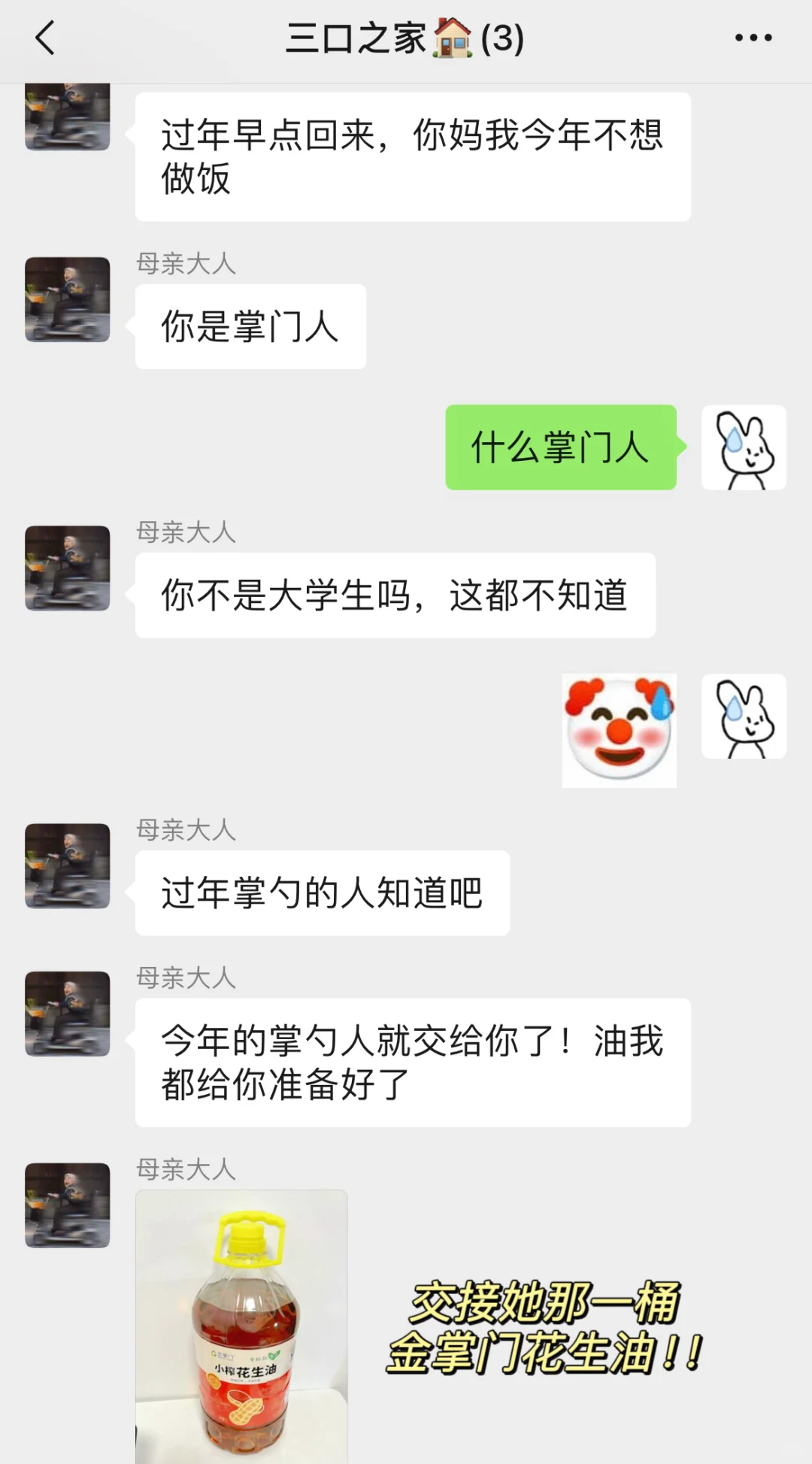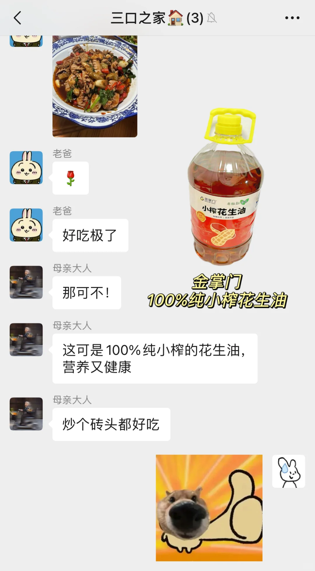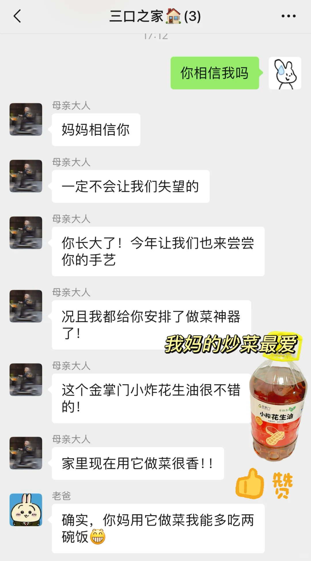 咱妈也是抽象上了看来没少上网冲浪[大笑R][大笑R] 还知道掌门人的梗了 还给我整个金掌门的交接仪式 就是交接她的那一桶金掌门小炸花生油哈哈哈哈哈 妈妈说用这个炒菜很放心 传统的小炸工艺 有着浓浓的花生味 炒菜时不油腻不抢味 吃得安心用的放心 嘿嘿看在还有红包的份上 过年夜我高低给他们露一手