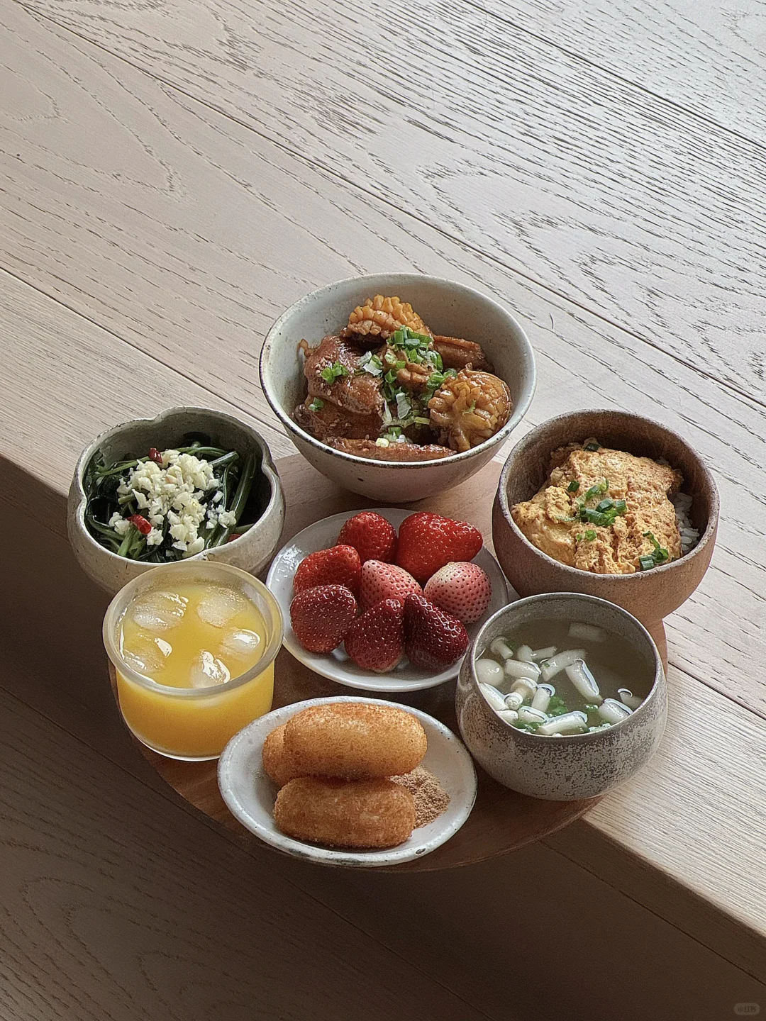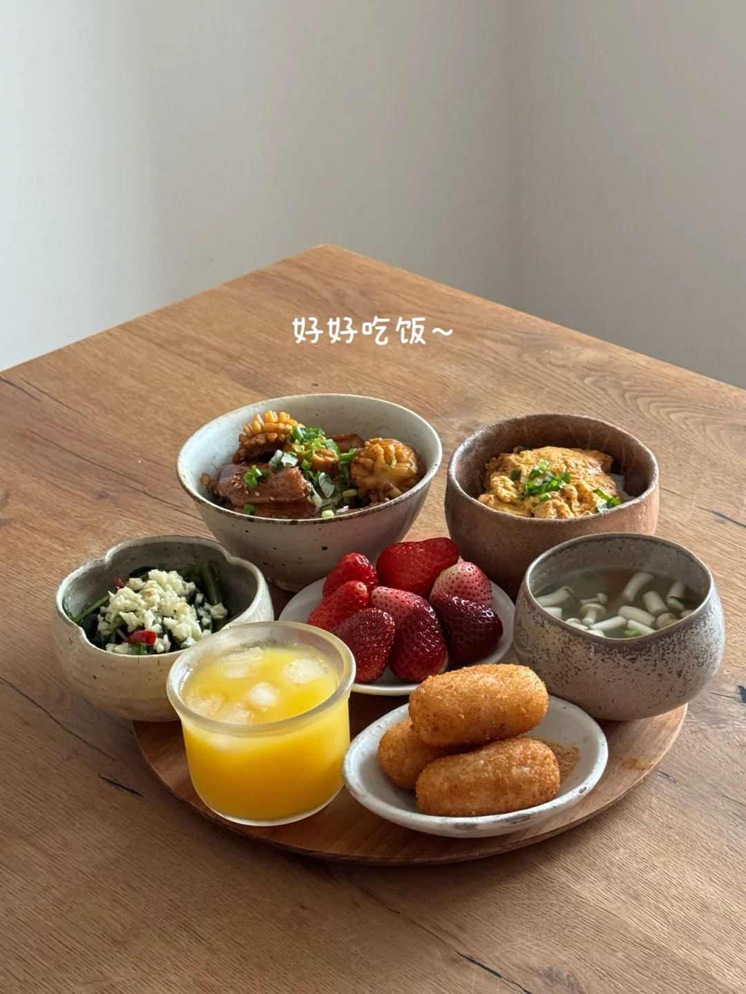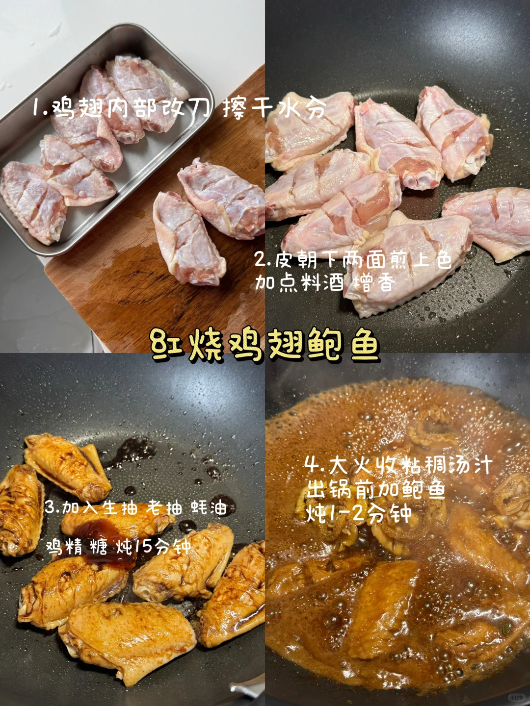 - 今日菜单📝 红烧鸡翅鲍鱼🍗 水焖蛋盖饭🍚 炝空心菜🥬 菌菇味增汤🍄‍🟫 红糖爆浆糍粑🫔 三色草莓🍓 橙汁🍊 - 红烧鸡翅鲍鱼🍗做法附图 少油少糖就没有太多的粘稠感~ - 炝空心菜🥬做法附图 空心菜的叶和茎成熟度不同 分开焯水可以保证均匀成熟 因富含铁元素 加热后的空心菜 叶绿素在高温下流失 使其发黑 可以提前泡白醋或油多点 快炒 - 爆浆红糖糍粑🫔 一般外面饭店吃的红糖糍粑 红糖淋外面 这个红糖酱在里面 一口爆浆烫鼠我了! 好吃到我要给它列入年夜饭甜品菜单! - 水焖蛋盖饭🍚做法附图 嫩就一个字 我只说一次 盖饭绝绝子 一定要用冷水 然后倒入蛋液焖 不然开水倒入蛋液直接变成蛋花hh