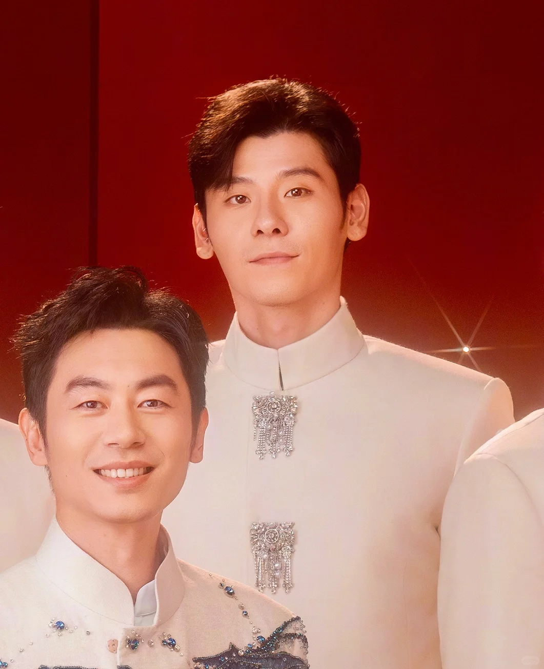 在无锡分会场,倪妮以我们的红色新中式套装开场,搭配的锦鲤刺绣羽绒马甲保暖又精致,让人一秒回到玉墨。蒋奇明在春晚白西装男团里,演绎了我们的手工银扣装饰立领西装。