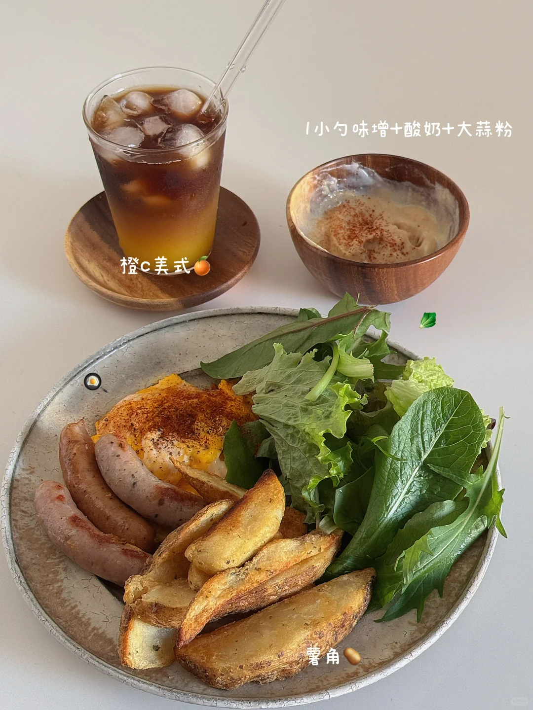 第二天就做了薯角+沙拉+鸡蛋+香肠