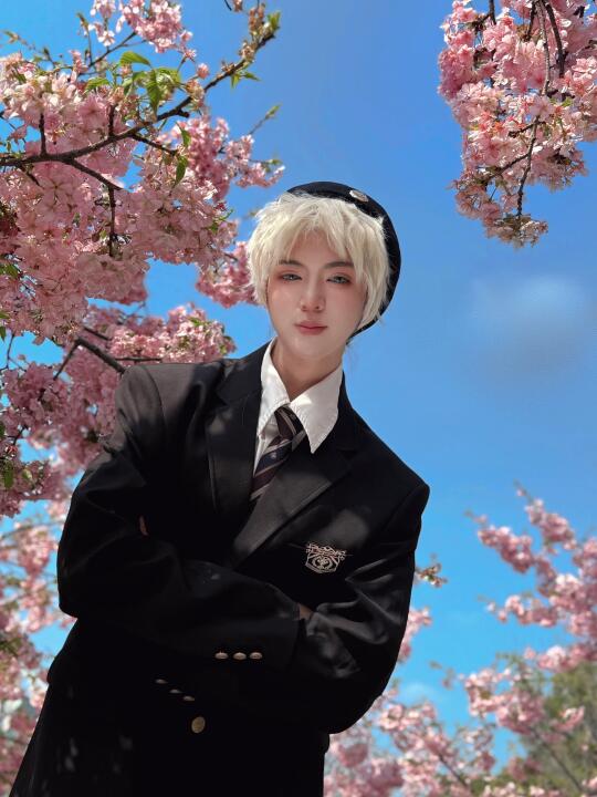 风拂柳,粉樱绽放,我身着浅粉蕾丝旗袍,立于古栏之下。长袖轻笼,盘髻缀珠,耳坠摇曳