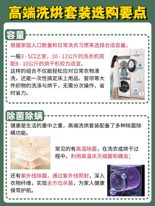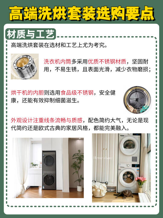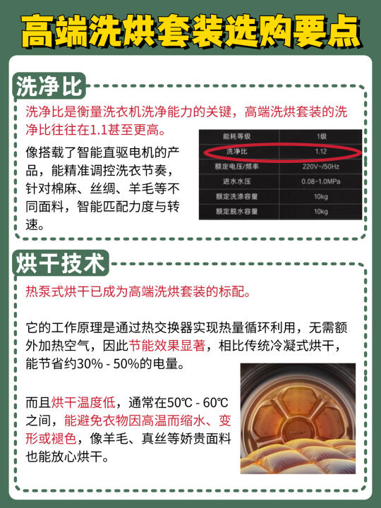家人们,洗衣服时有没有遇到衬衫洗完皱巴巴、羽绒服烘干后结块、毛绒玩具洗后不蓬松这些糟心事?我之前用一体洗烘机,真的被这些问题折磨疯了!后来狠狠研究了各大高端洗烘套装,总结出这篇超实用攻略,全是干货,建议收藏! ✅洗净比 洗净比是衡量洗衣机洗净能力的关键,高端洗烘套装的洗净比往往在1.1甚至更高。 ✅烘干技术 热泵式烘干已成为高端洗烘套装的标配。 它的工作原理是通过热交换器实现热量循环利用,无需额外加热空气,因此节能效果显著,相比传统冷凝式烘干,能节省约30%-50%的电量。 而且烘干温度低,通常在50℃-60℃之间,能避免衣物因高温而缩水、变形或褪色,像羊毛、真丝等娇贵面料也能放心烘干。 ✅容量 根据家庭人口数量和日常洗衣习惯来选择合适容量。 一般3-5口之家,10-12公斤的洗衣机搭配8-10公斤的烘干机较为适宜。 ✅除菌除螨 健康是生活的重中之重,高端洗烘套装配备了多种除菌除螨功能。 ✅材质与工艺. 高端洗烘套装在选材和工艺上尤为考究。 🔺洗衣机内筒多采用优质不锈钢材质,坚固耐用,不易生锈,且表面光滑,减少衣物磨损; 🔺烘干机的内胆则选用食品级不锈钢,安全健康,还能有效抑制细菌滋生。 🔺外观设计注重线条流畅与质感,配色简约大气,无论是现代简约还是欧式古典的家居风格,都能完美融入。 ✅静音效果 高端洗烘套装通常采用先进的降噪技术,运行时噪音极小。 ✅品牌售后 选择知名品牌至关重要。西门子、博世、松下等国际大牌,凭借多年技术沉淀,产品质量可靠,性能稳定。 完善的售后服务网络能提供及时的安装、维修和保养服务,购买后还有长时间的质保期,使用起来更安心。 希望这份攻略能帮大家选到满意的洗烘套装,从此告别洗衣烦恼!要是还有其他问题,欢迎评论区留言👇