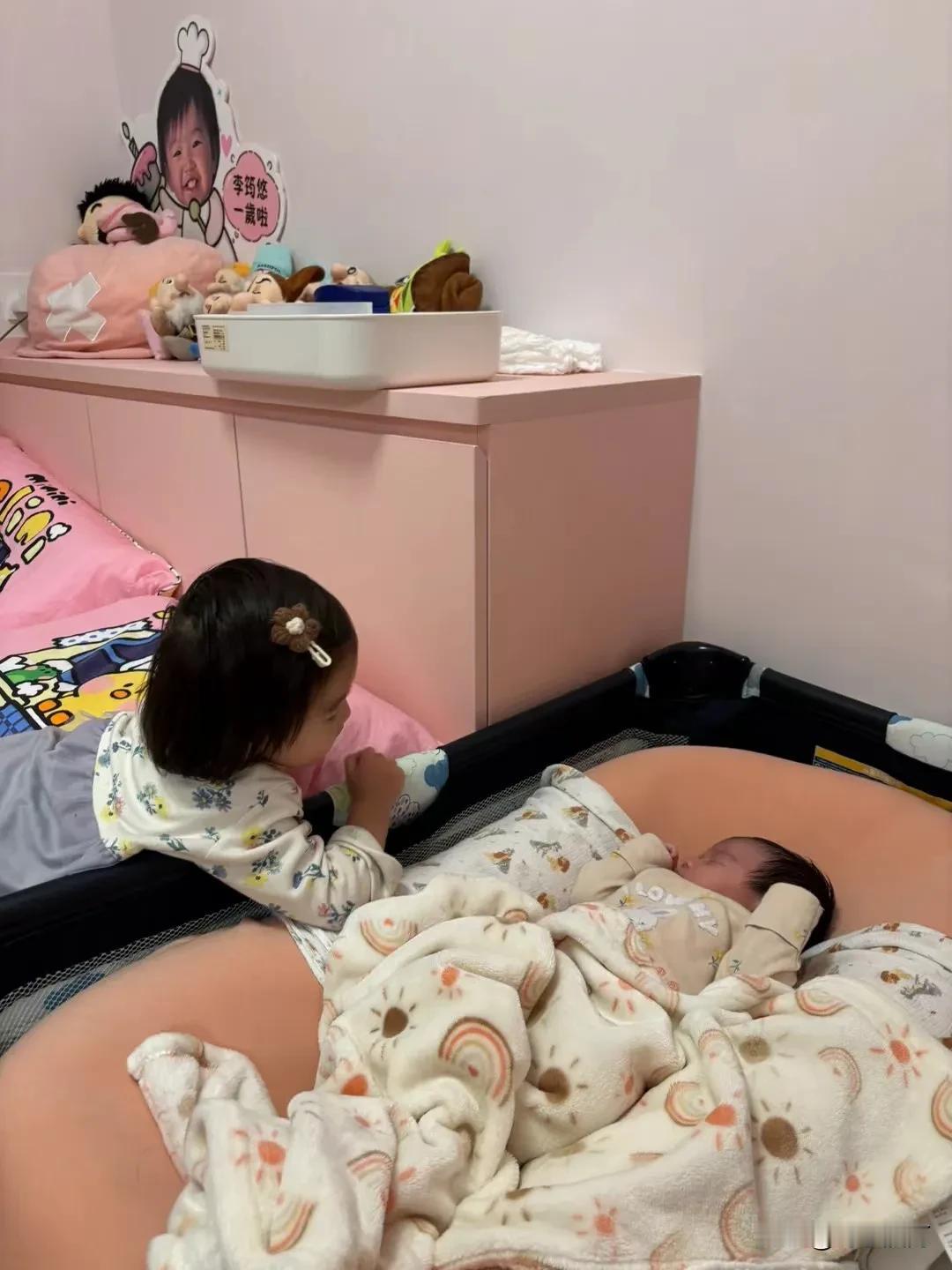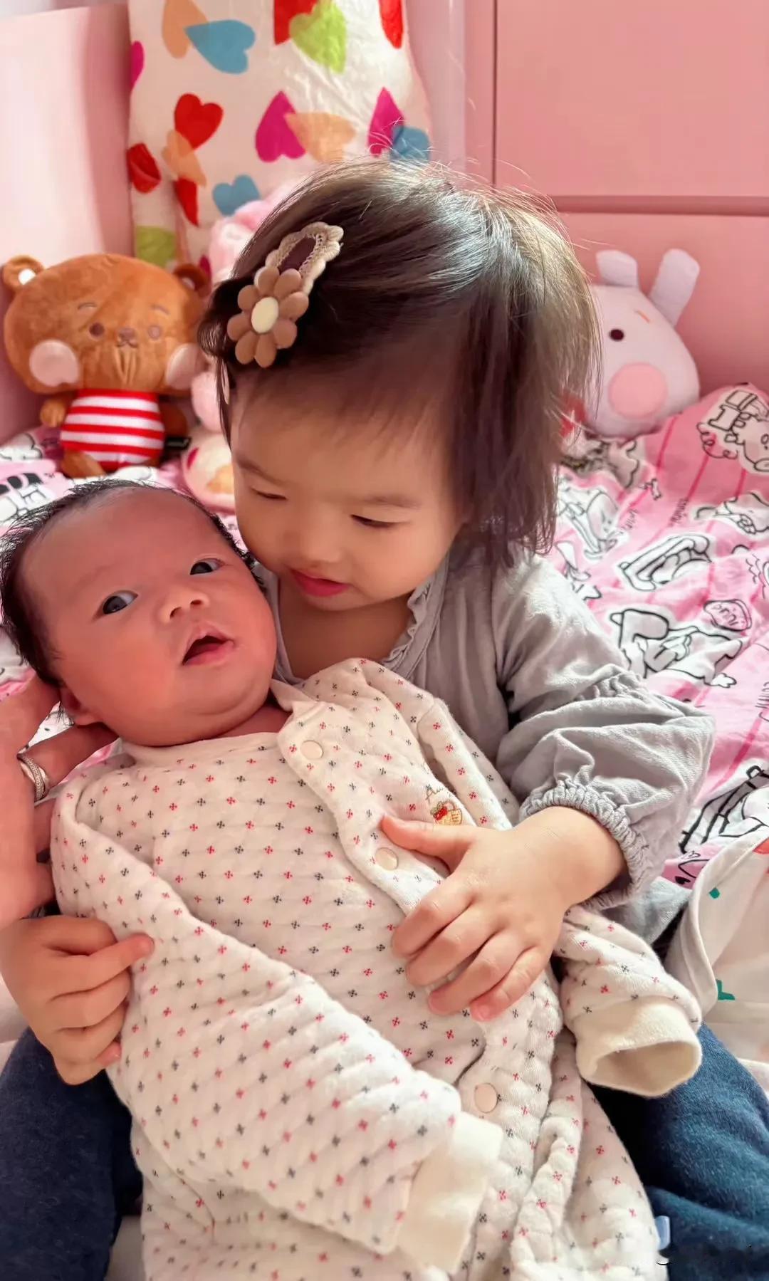 晒出你家宝贝很懂事的样子十五个月大的姐姐小豆丁和十五天大的妹妹小汤圆。