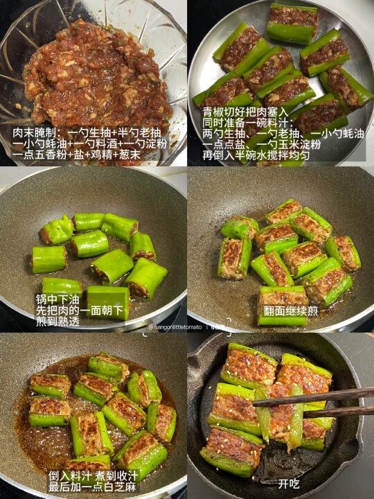 2)青尖椒切块,肉馅挤入,锅中下油,肉馅先朝下煎到熟透再翻面煎,倒入料汁煮到收汁即可