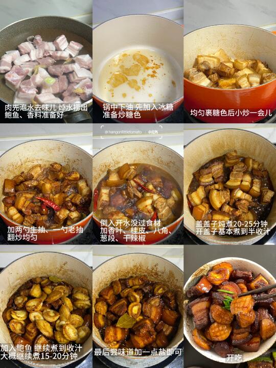 五花肉|鲍鱼|葱|姜|香叶|桂皮|八角|干辣椒|生抽|老抽|冰糖