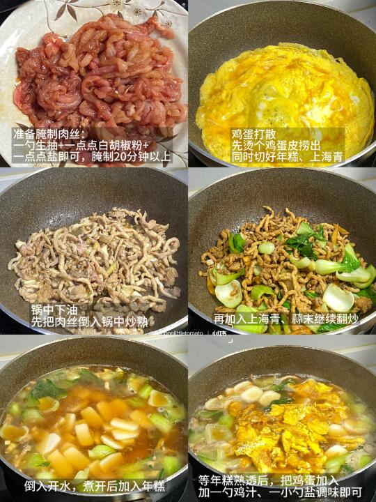 年糕|肉丝|上海青|鸡蛋|蒜末