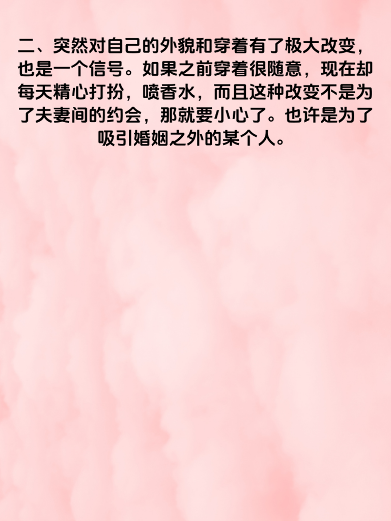 一、在婚姻生活中,婚外情往往有着一些微妙的预警信号。当你的伴侣开始频繁地对自己的手机格外紧张时,这可能就是一个危险信号。比如,之前手机随意放置,现在却总是不离手,还设置了新的密码,每次收到消息都偷偷查看,这很可能是在隐瞒与其他人的特殊联系。 二、突然对自己的外貌和穿着有了极大改变也是一个信号。如果之前穿着很随意,现在却每天精心打扮,喷香水,而且这种改变不是为了夫妻间的约会,那就要小心了。也许是为了吸引婚姻之外的某个人。 三、还有就是对夫妻间的亲密接触开始变得冷淡。以前的拥抱、亲吻都是很自然的事,现在却总是找借口回避,借口可能是工作太累或者身体不舒服,但如果这种情况持续很长时间,可能是因为心里有了别人,不再对自己的伴侣有亲密的渴望。