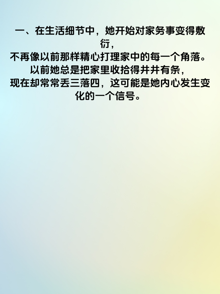 一、在生活细节中,她开始对家务事变得敷衍,不再像以前那样精心打理家中的每一个角落。以前她总是把家里收拾得井井有条,现在却常常丢三落四,这可能是她内心发生变化的一个信号。 二、她与你相处时,眼神中少了以往的温柔和爱意,更多的是一种冷漠或者游离。以前她看你的眼神就像有星星闪烁,现在却变得黯淡无光,这无疑是她内心变化的体现。 三、她开始频繁地找各种借口外出,并且不愿意告诉你她的行踪。以前她总是会第一时间和你分享她的生活,现在却变得神秘兮兮,这很可能是她在外面有了别的心思。 四、她对性生活的态度也发生了改变,不再像以前那样主动和热情,而是变得敷衍或者拒绝。这也是婚内变心的一个重要信号,因为性生活是夫妻关系中很重要的一部分。