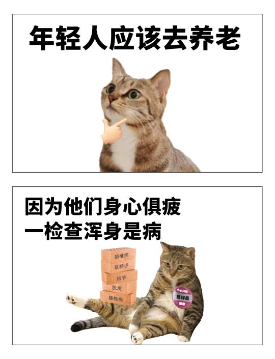老年人应该去上班 因为他们成熟稳重,而且还能早起 中年人应该去上学 因为他们总是后悔当初读书太少 小孩子应该做家务 因为他们精力充沛,有使不完的力气 而我们年轻人应该去养老 因为我们身心俱疲,一检查浑身是病 搞笑打工人不想上班职场早八早起大学生当代年轻人内容过于真实抽象精神状态猫吸猫麻辣黑白狸发疯文学摸鱼一刻我的摸鱼一刻梗图躺平