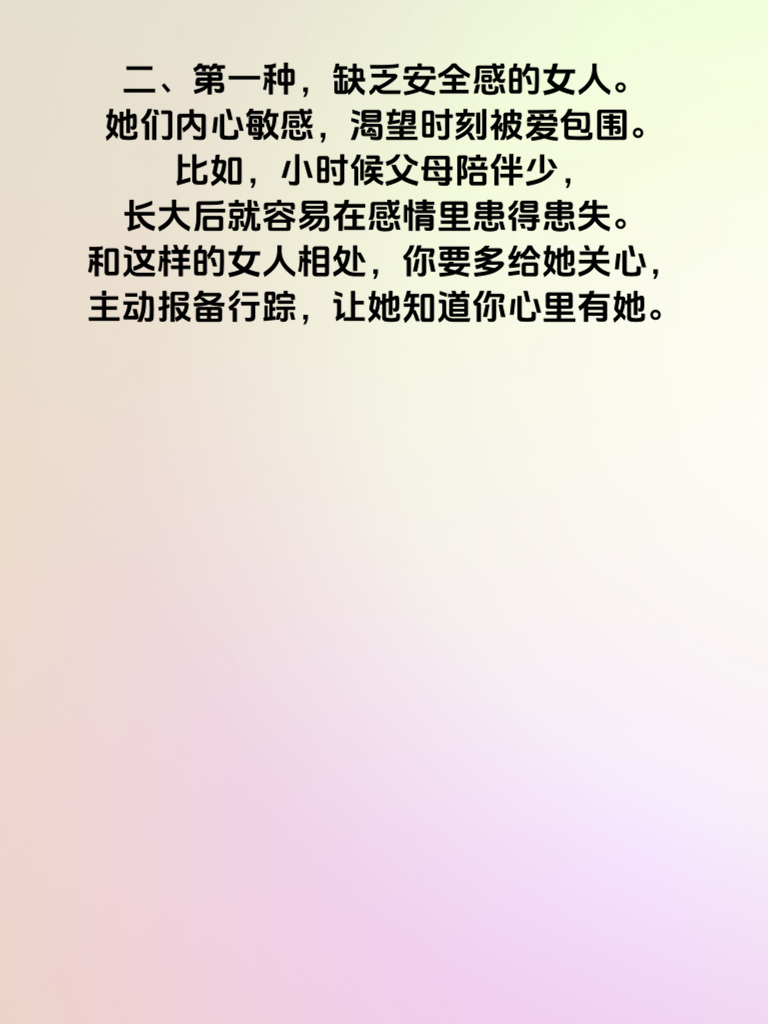 男人必读:这3种女人最爱黏人。在追求爱情的道路上,了解女人的心思至关重要。 第一种,缺乏安全感的女人。她们内心敏感,渴望时刻被爱包围。比如,小时候父母陪伴少,长大后就容易在感情里患得患失。和这样的女人相处,你要多给她关心,主动报备行踪,让她知道你心里有她。 第二种,极度依赖爱情的女人。爱情对她们来说是生活的重心。像那些把爱情当作全部的文艺女青年。你要给予她足够的情感回应,陪她做浪漫的事,让她沉浸在爱的甜蜜中。 第三种,热恋期的女人。刚陷入爱情,热情高涨。这时候她想和你时刻在一起。你可别嫌她黏人,要积极配合,一起享受这段美好的时光,加深彼此的感情。总之,读懂这三种女人的心思,巧妙应对,爱情之路会更顺畅。"
