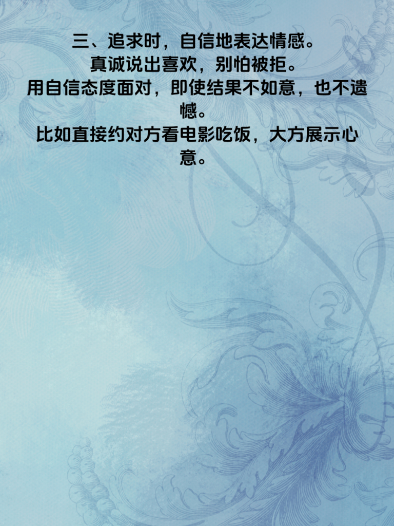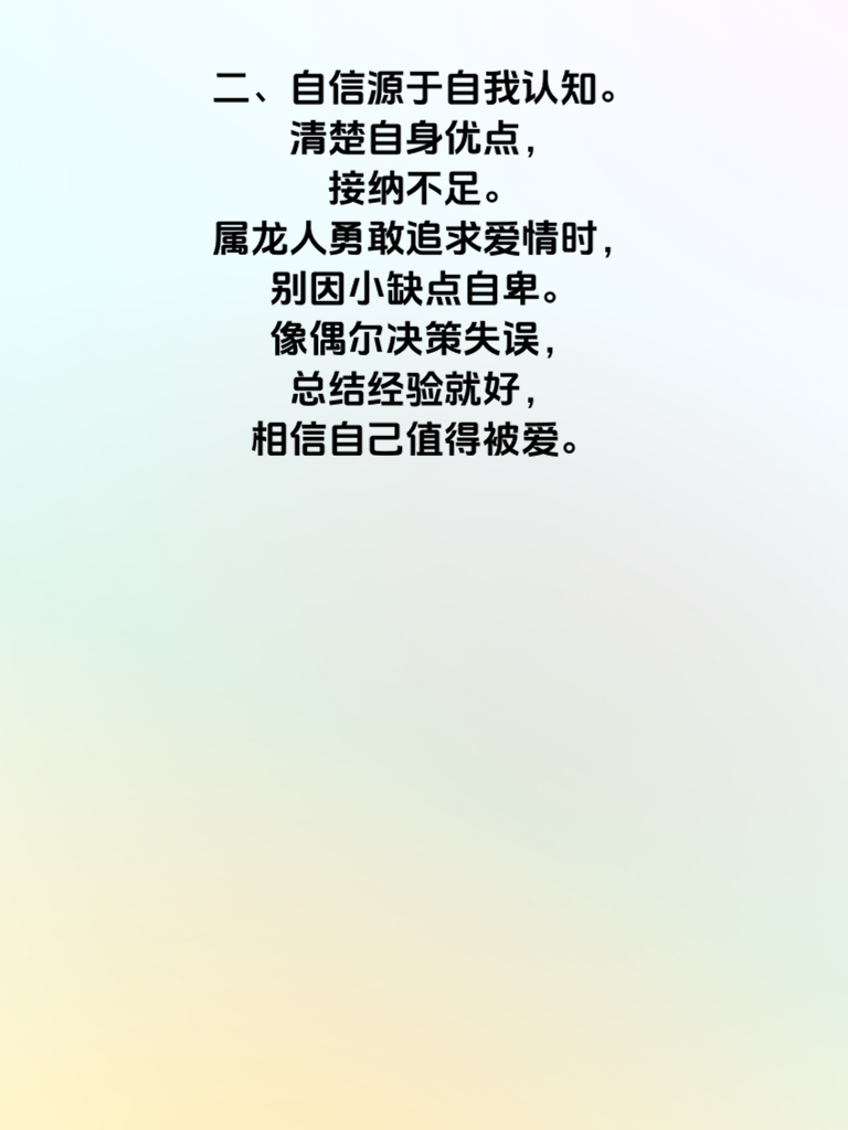 一、属龙的你,自信是独特魅力。在恋爱中,自信的气场能吸引目光。比如聚会时,大方自然与人交流,展现见识与想法,让心仪对象注意到你的闪光点。 二、自信源于自我认知。清楚自身优点,接纳不足。属龙人勇敢追求爱情时,别因小缺点自卑。像偶尔决策失误,总结经验就好,相信自己值得被爱。 三、追求时,自信地表达情感。真诚说出喜欢,别怕被拒。用自信态度面对,即使结果不如意,也不遗憾。比如直接约对方看电影吃饭,大方展示心意。 四、恋爱里,自信能带来平等。不患得患失,不过分讨好。尊重彼此,自信表达需求想法。如安排约会,自信说出想去的地方和活动,让感情更健康。