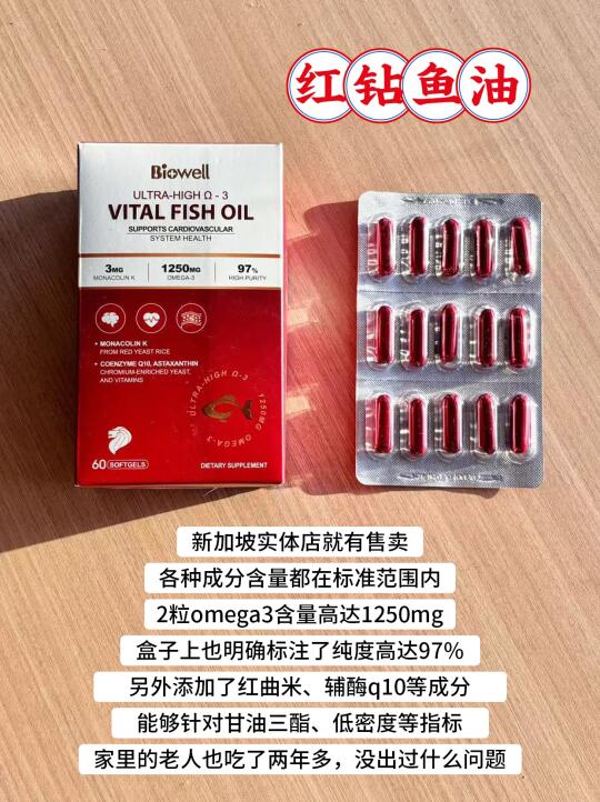 这款是回购很多次的,新加坡比较火的复合鱼油,2粒含有1250mg的omega3,明确纯度是97%,还有IFOS每批次认证,口碑方面也一直做的还不错,关键还添加了红曲米、辅酶q10等5种成分,能针对甘油三酯和低密度,也对心脏、皮肤友好。目前爸妈也吃了两年多了也没什么问题,而且也记得每天按时吃