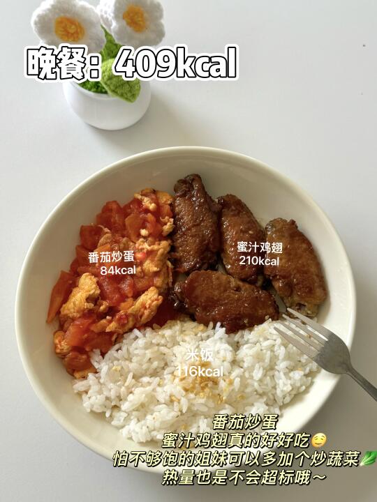 [打卡R]晚餐:番茄炒蛋➕蜜汁鸡翅➕米饭🍚(409kcal🔥)