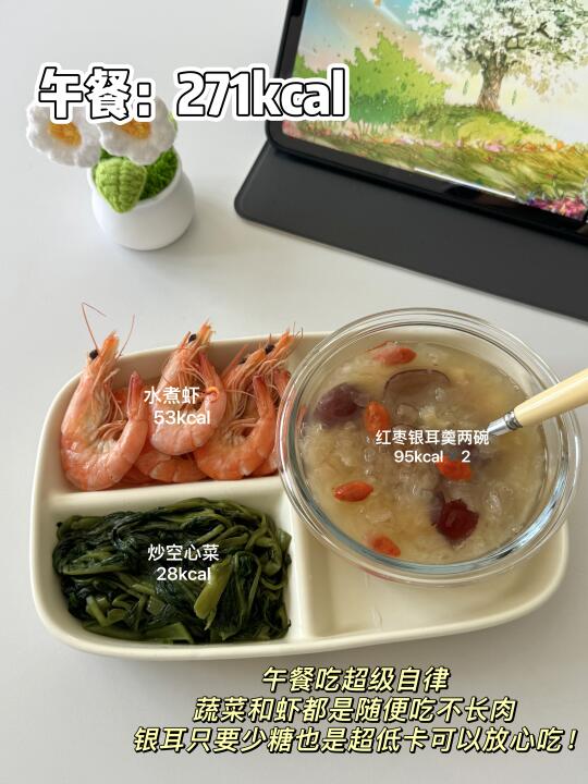 [打卡R]午餐:水煮虾➕炒空心菜➕银耳羹(271kcal🔥)